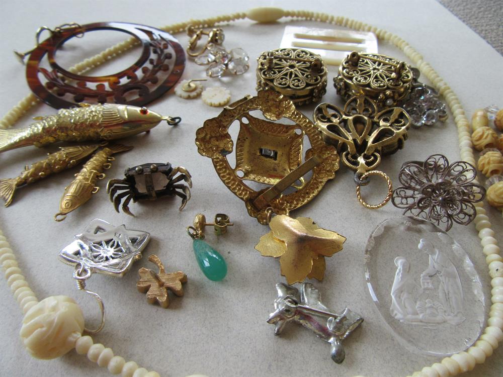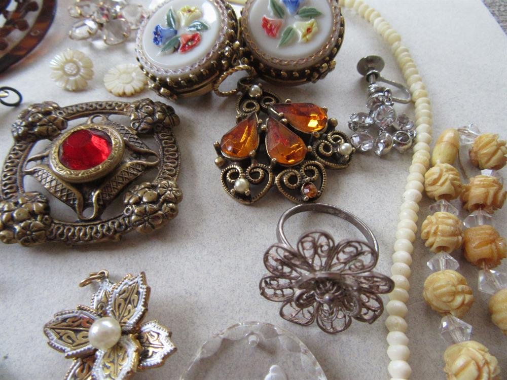 Vintage 1020's and up jewelry making cart lot. A little bit of everything. The small crab used to be a tie tac. It is sterling silver (although unasked) and it has a feared smokey quartz stone,. The two HEAVY floral glass pins are missing seed pearls on the side. Filigree ring and the rest! Some pieces are wearable, but this lot is being sold as a crafting lot.