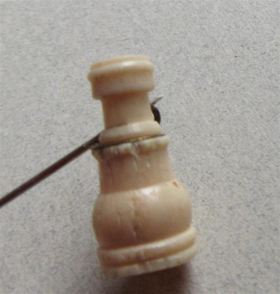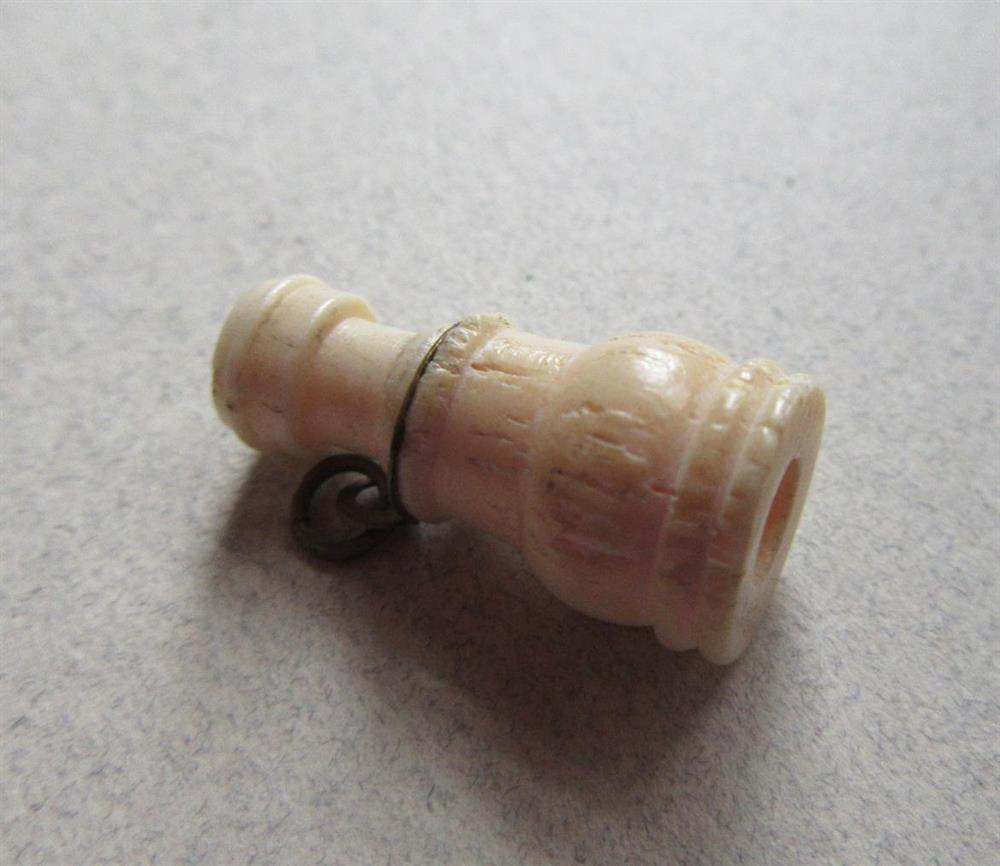 1939 Stanhope turned bone binocular charm. The photo on the inside is The World of Tomorrow. It measures 3/4" long X 5/16” wide. Original rings.