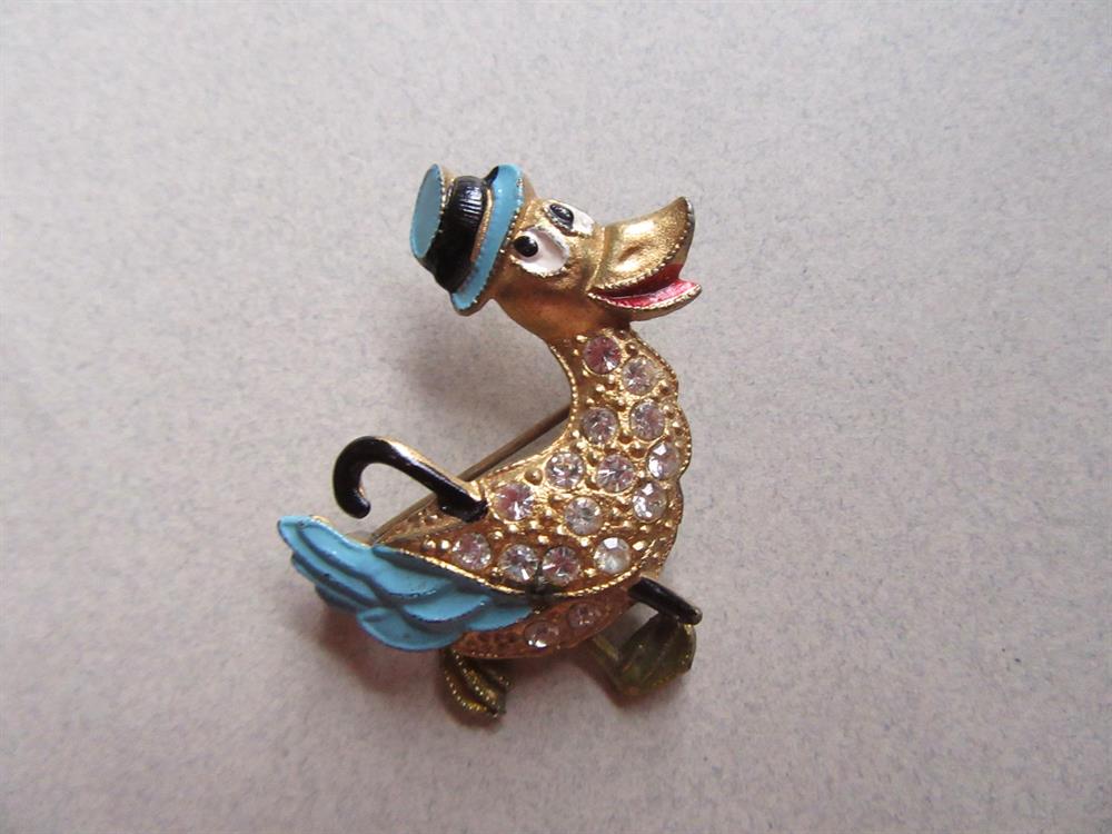 1940's Anthropomorphic Rhinestone Duck Pin Articulated Spinning Legs Figural