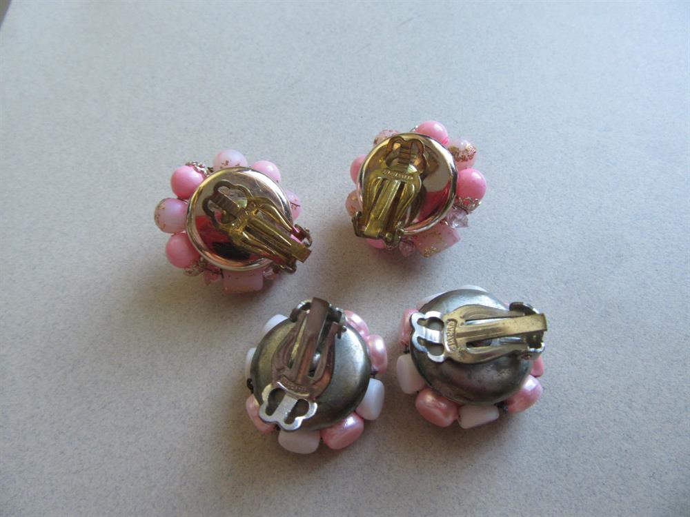 Vintage 1950's pink cluster earrings. Both pairs signed Japan. Measure 1" across. Wonderful shape! Clip tension has been tested and they are nice and tight.