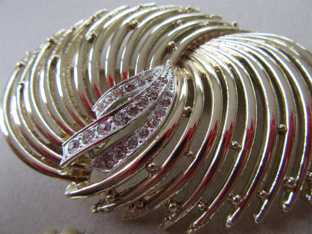 Vintage 1950's gold pin with rhinestones pin and clip earrings set. The large pin measures 2 3/4" long. The clip earrings tension has been tested and they are nice and tight. Excellent shape.