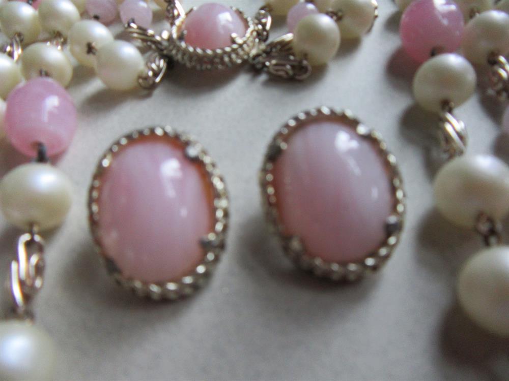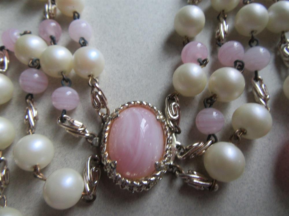 1950's Vintage Pink Swirly Glass and Faux Pearls Necklace Set As Is