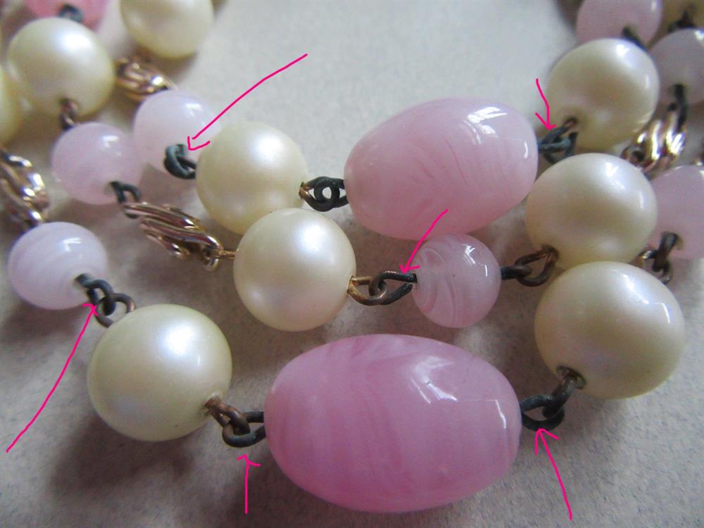 The SHORTEST strand of the necklace measures 20" long. There is some greening and darkening to the metal links between the beads. I pointed this out in the photos. This is mostly being sold as a craft piece for the pink glass beads. But of course is still wearable.