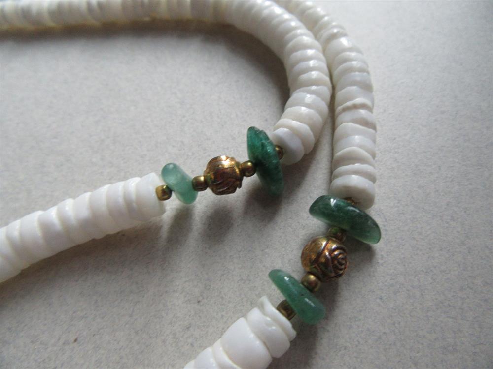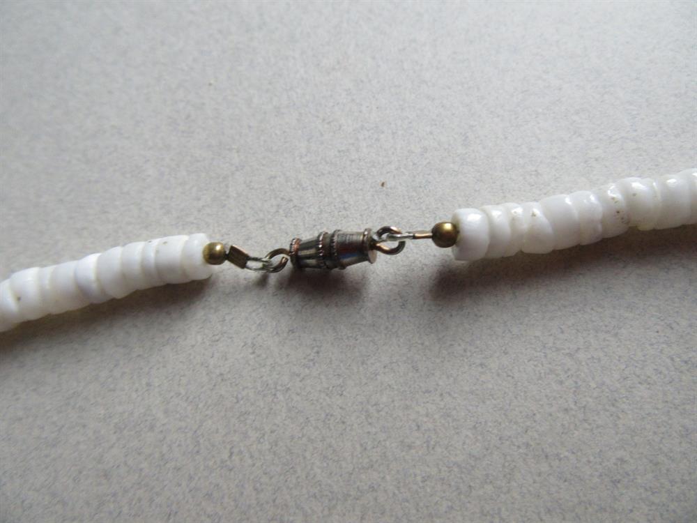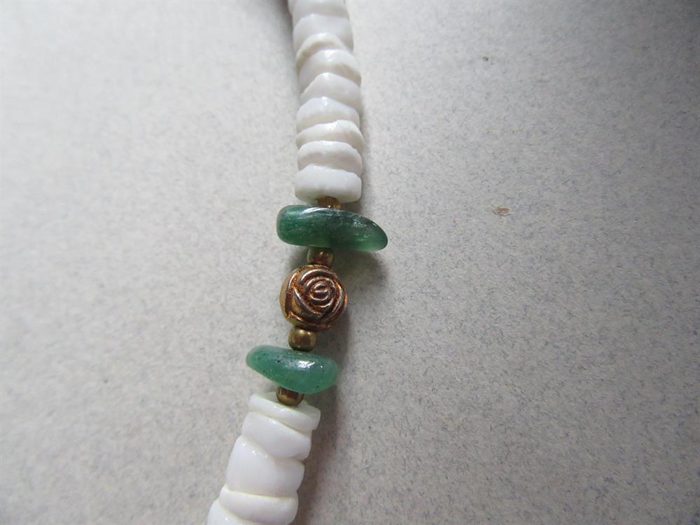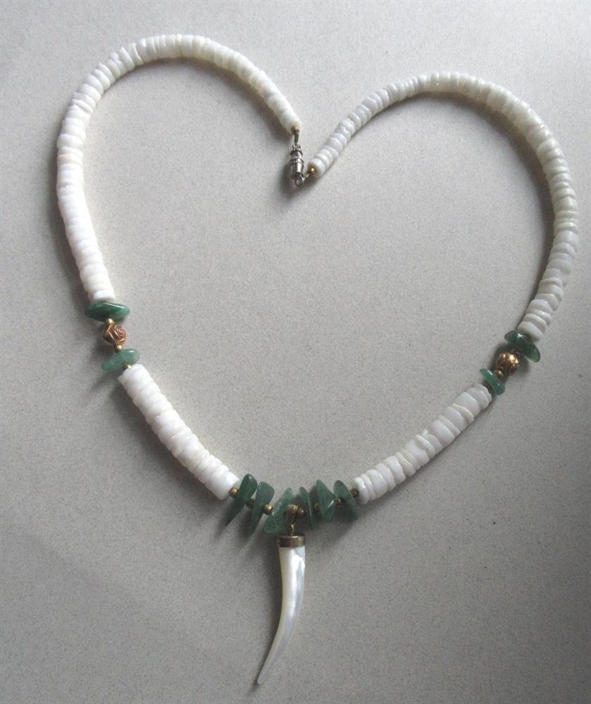 Vintage 1970's pucca shell necklace with a mother of pearl horn pendant. It has gemstone chip beads and gold tone metal rose beads.