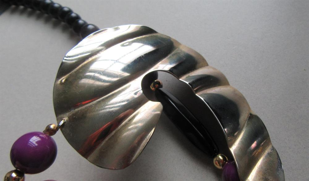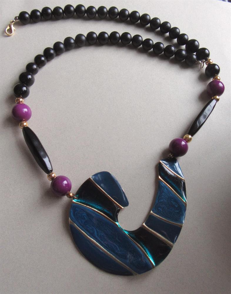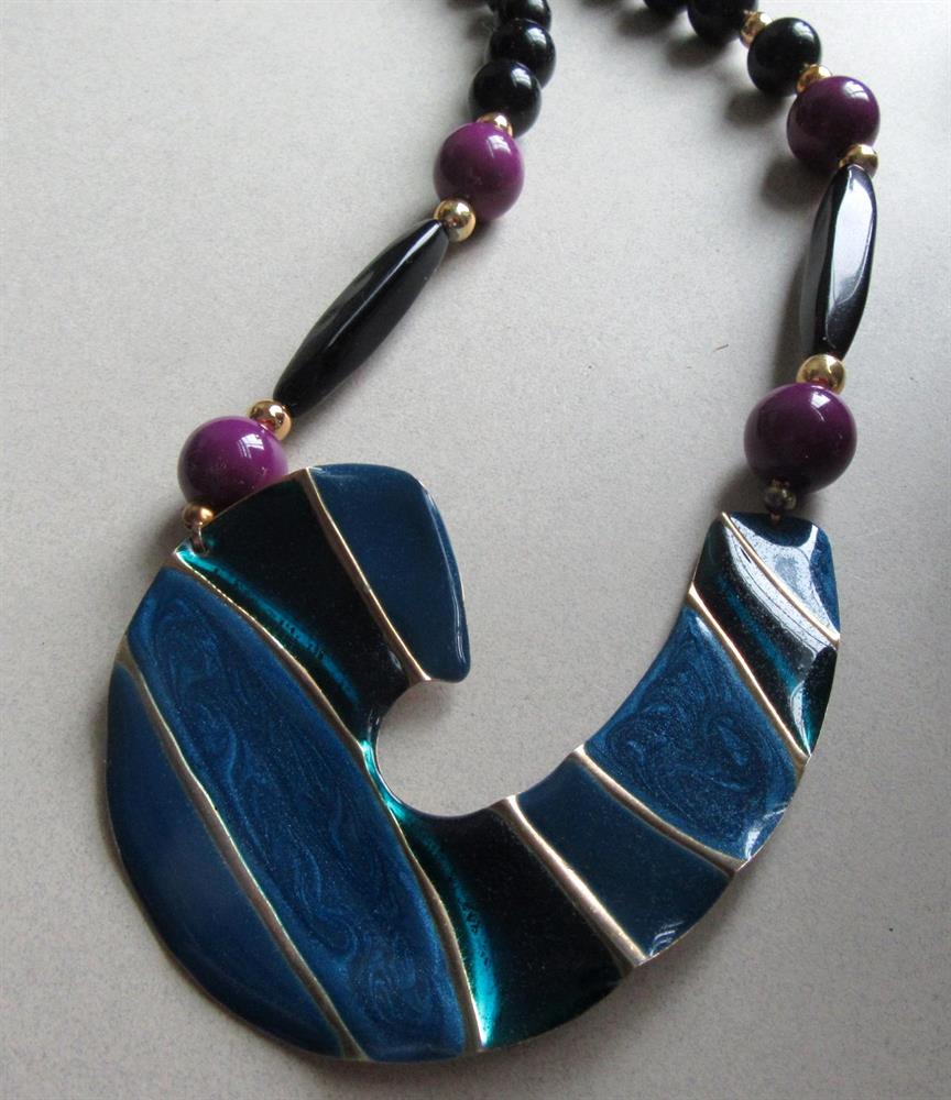 BIG 1980's necklace with huge enameled center piece. It measures 25" long. Purple round lucite beads, long black lucite beads and gold tone spacers. Excellent shape.
