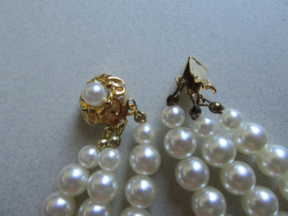 1980's faux pearl triple strand necklace with swirly pink glass and rhinestone center pendant. The SHORTEST strand measures 15 1/4" long. the pendant is 2" long and 1 1/4" at the widest part. Interlocking clasp. Heavy necklace! Wonderful shape.