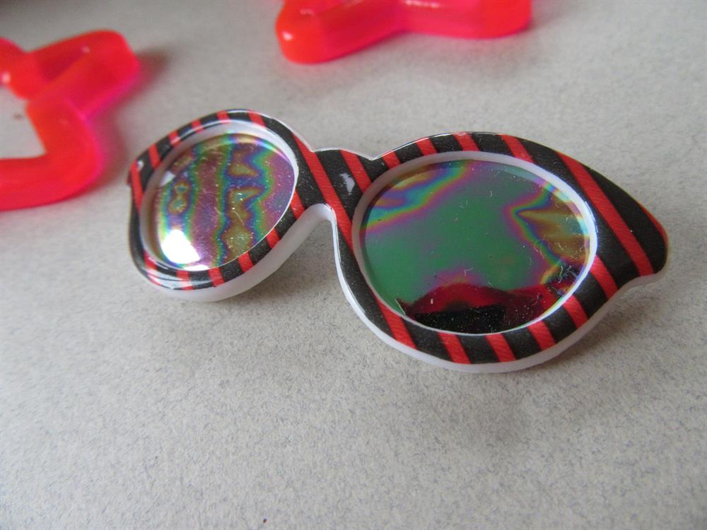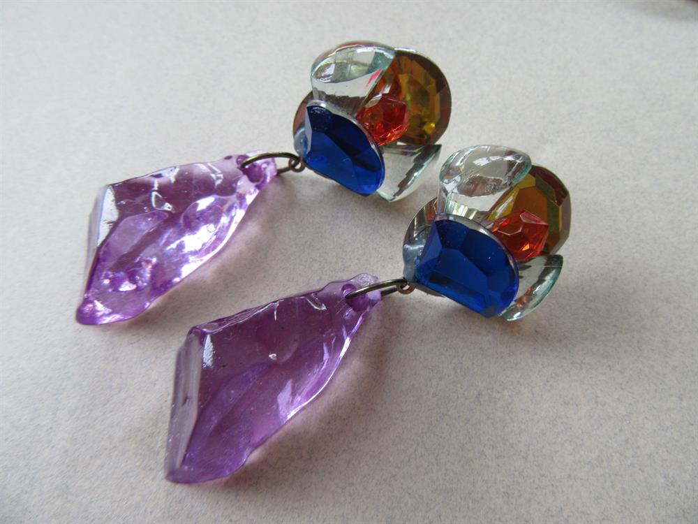 Vintage 1980's jewelry lot. Iridescent sunglasses pin and two pairs of lucite earrings. The top pair just needs earring backs.