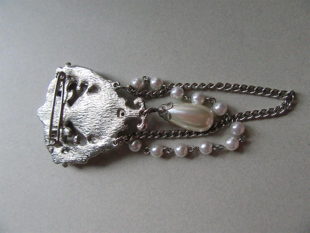 Original 1980's red rhinestone and faux pearl pin. The pin shaft is heavy duty and this pin is made to be worn on a coat or jacket lapel. They used to wear these pins with others on a jacket. It measures 5" long and it is in excellent shape. A must for your 1980's garb or costume.