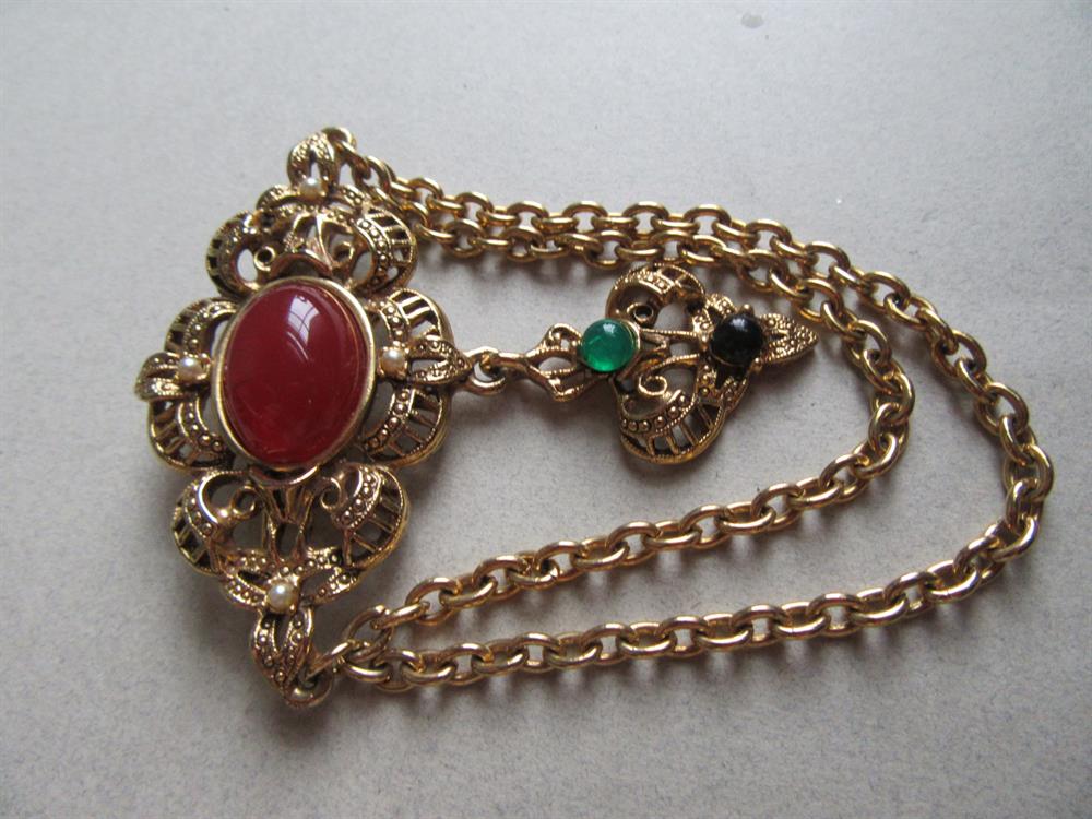 Vintage 1980's chatelain pin. The carnelian colored pin in the center is lucite and it is accented with four tiny faux seed pearls. Also a green and black round stones in the hanging charm.