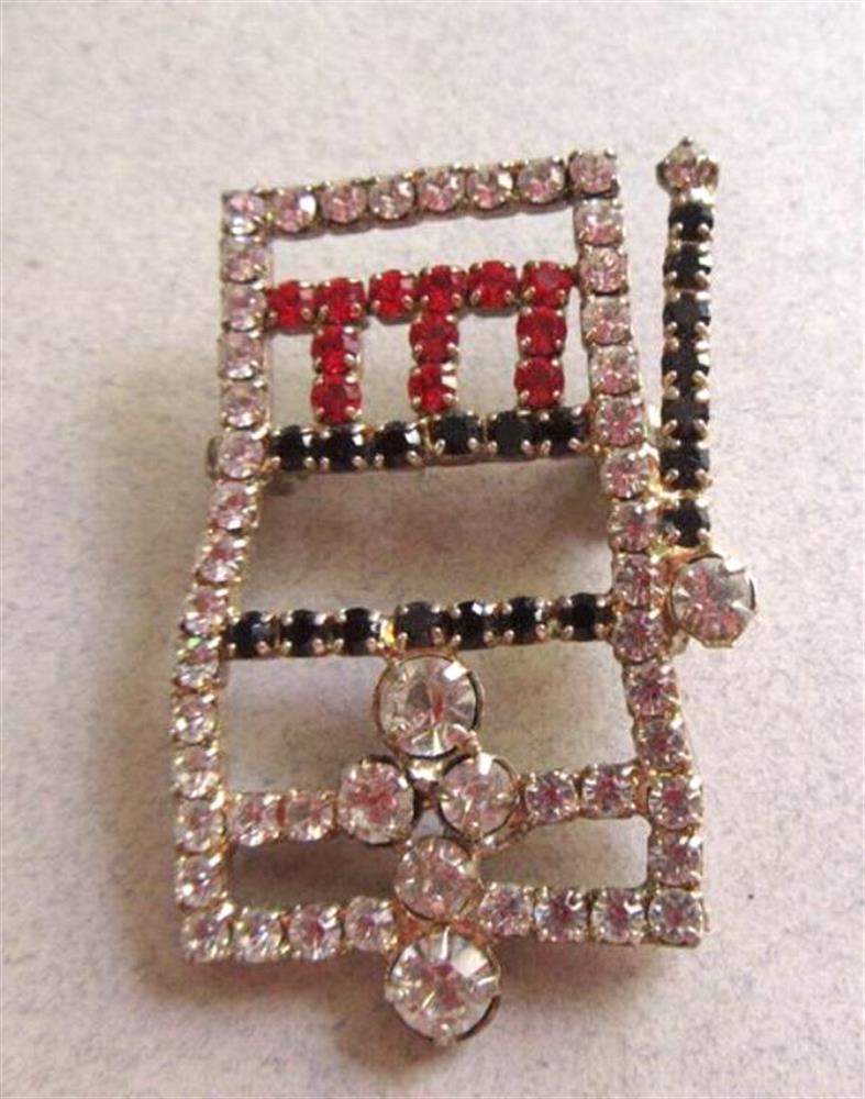 My Mom's 1980's lucky 777 rhinestone slot machine pin. Aren't those red 7's nice to see! The pin measures 1 1/2" long. No missing stones. Great shape.