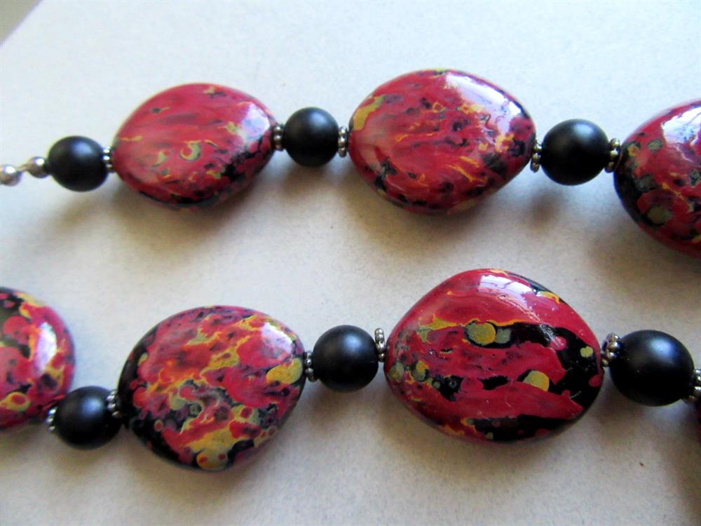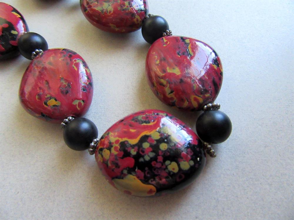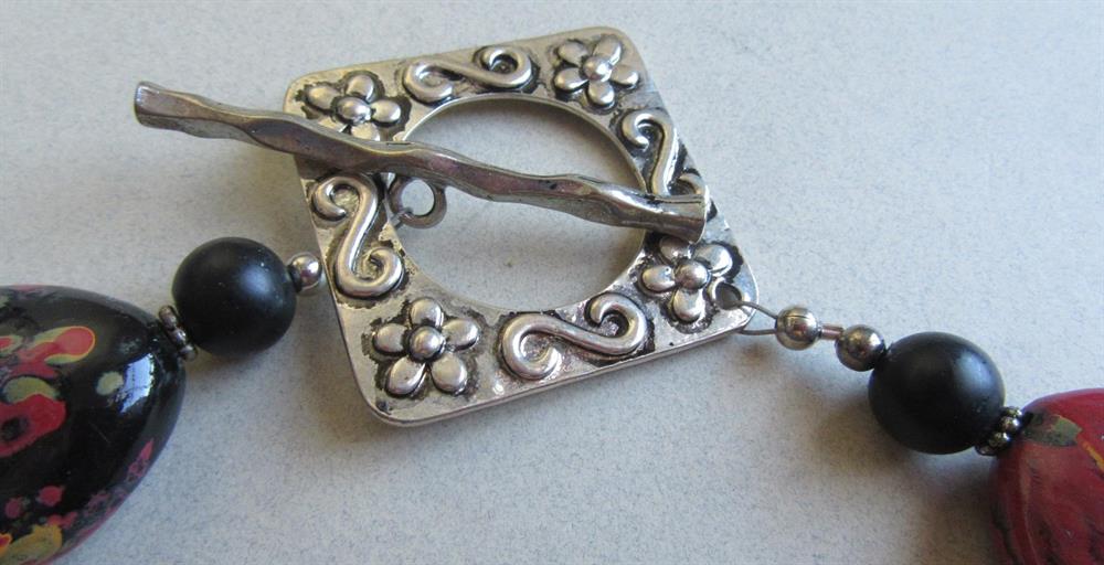 Very cool 1990's necklace with a giant metal floral toggle clasp. It measures 19" long. Excellent shape.