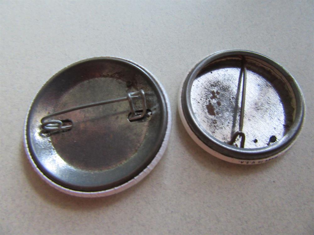 2004 anti George W. Bush "Buck Fush" pin back buttons. The one on the left measures 1 1/2" across and has some wear and a pin hole. Sold as is.