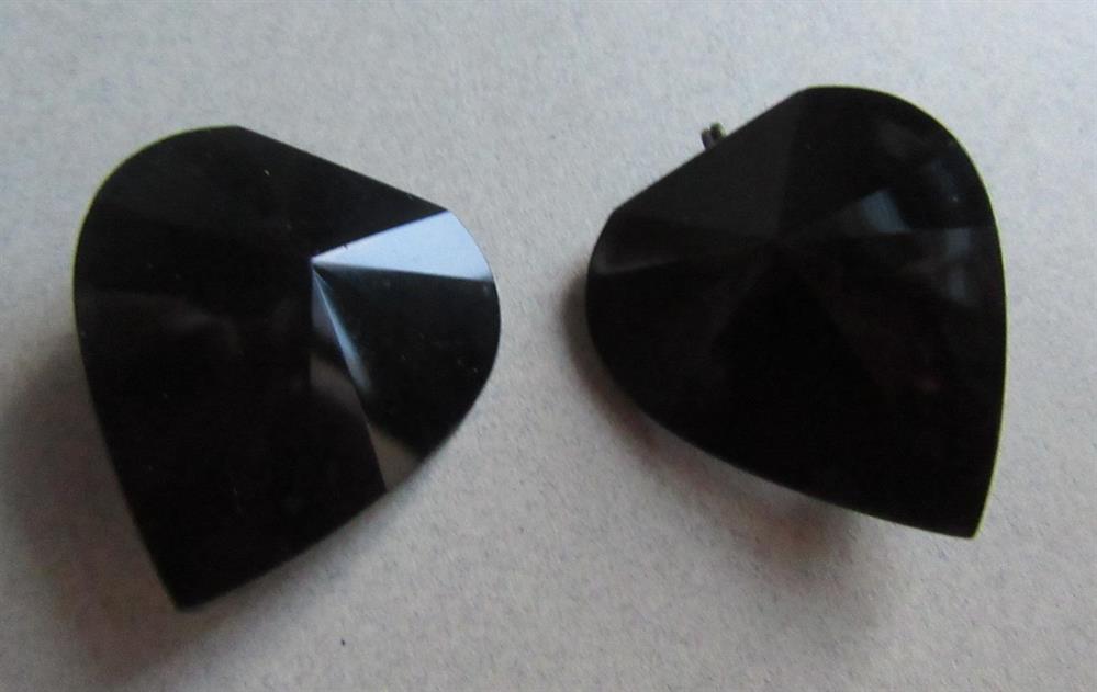 Antique black glass heart shaped cloak clasp. It measures 2" long and has metal shanks and hook. A couple of very minor nips. It's an oldie!