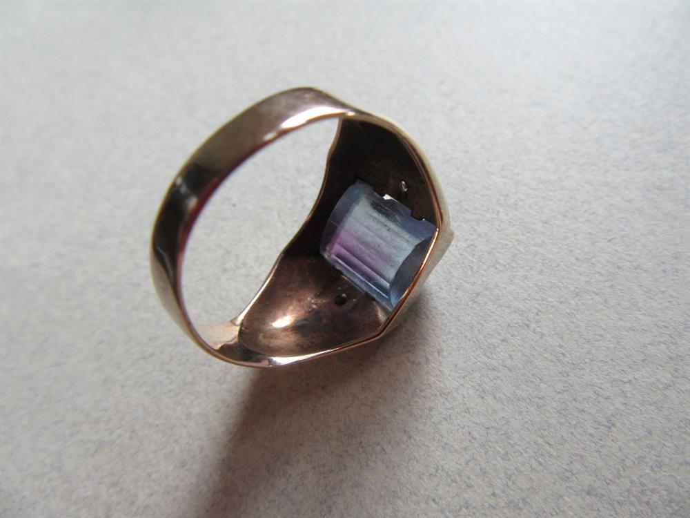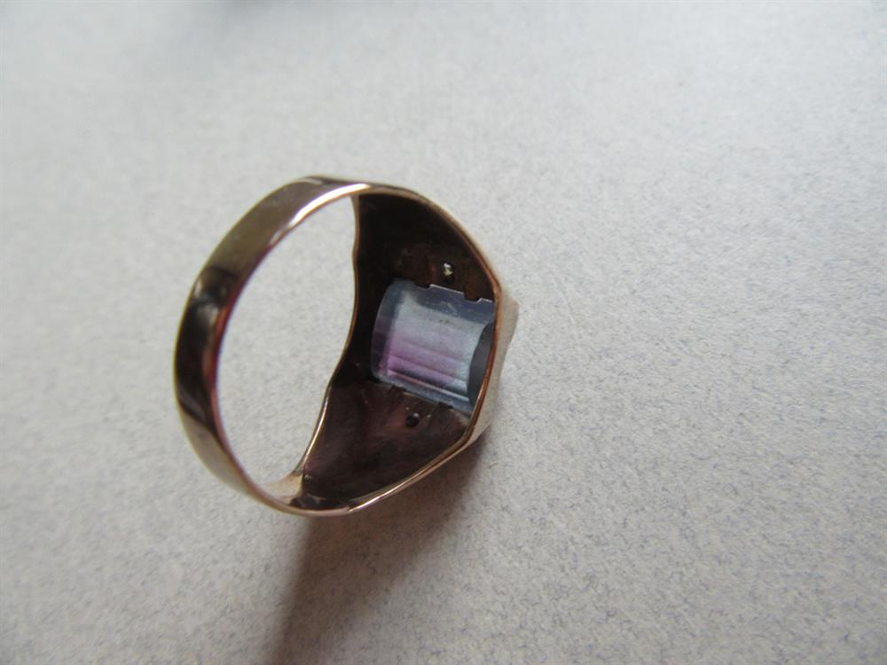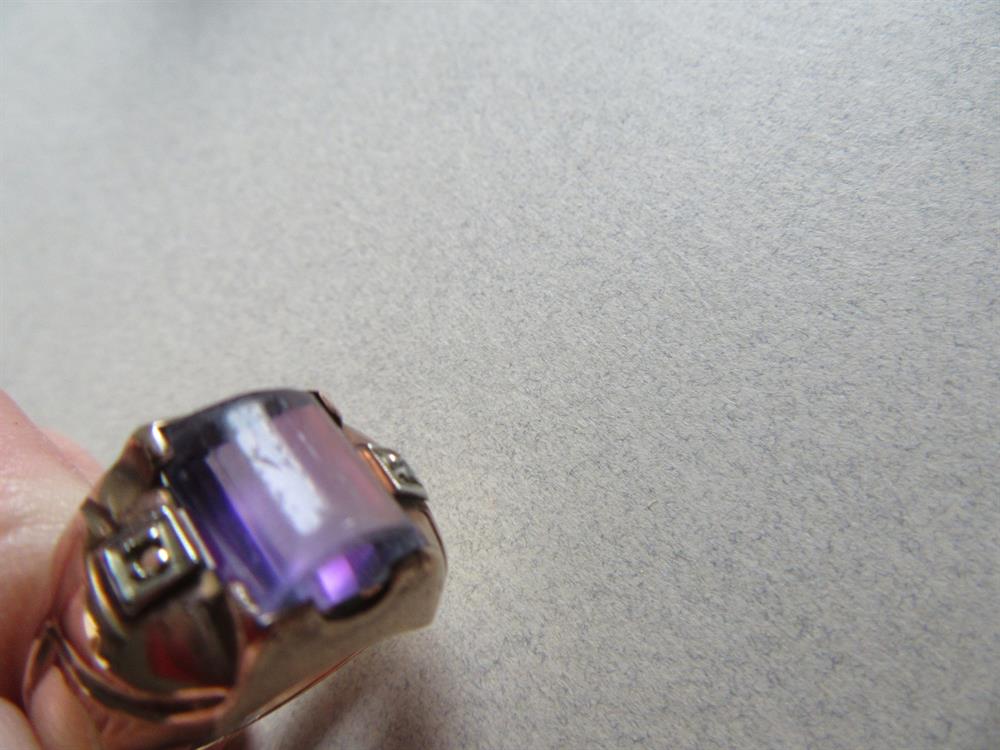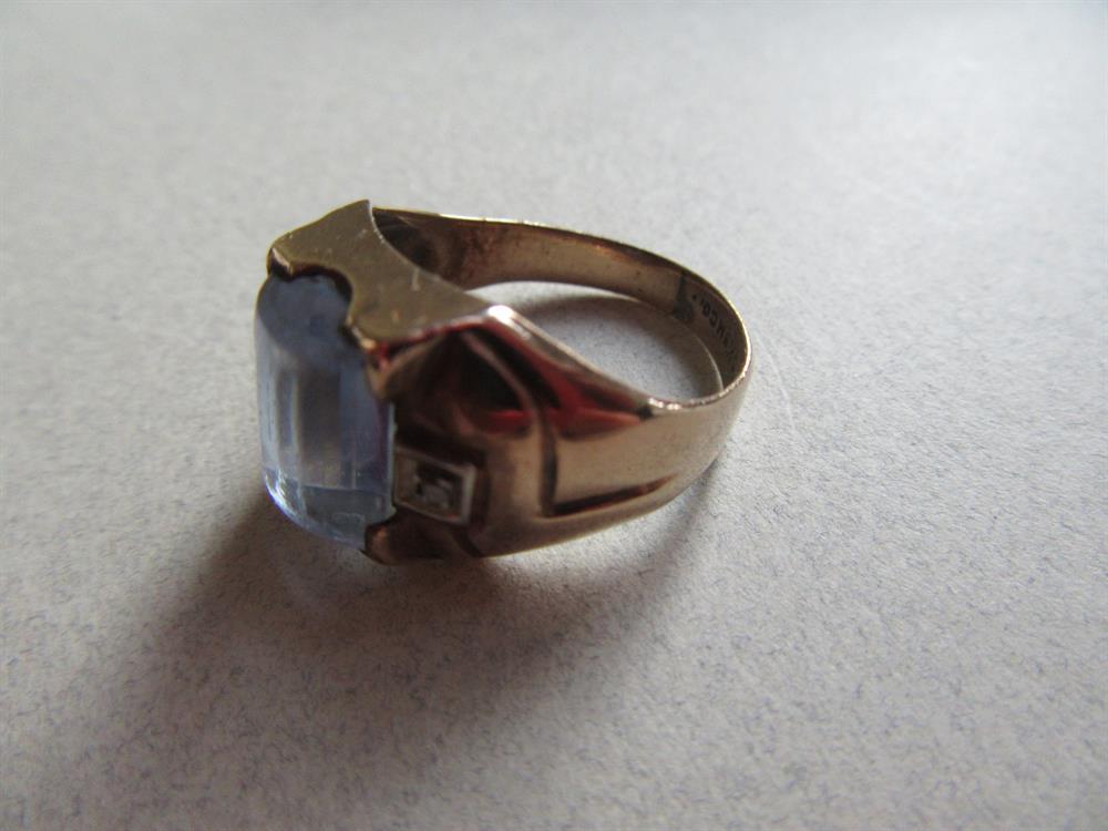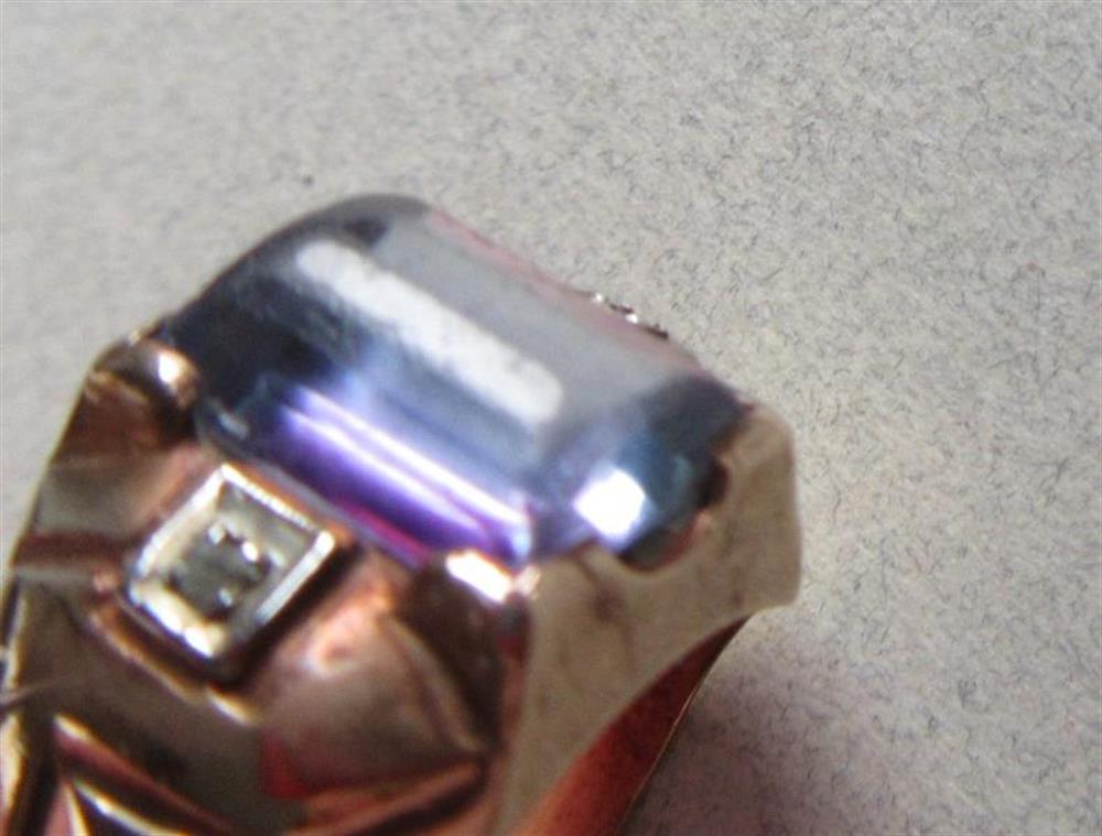 Art deco vintage 10k ring that has a VERY worn glass stone and also a missing stone on the side. The one stone that is on the side has damage. The ring is a mess.