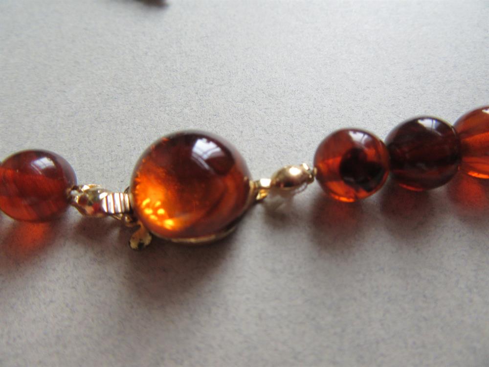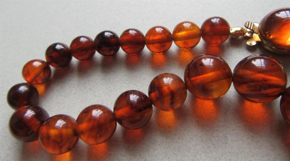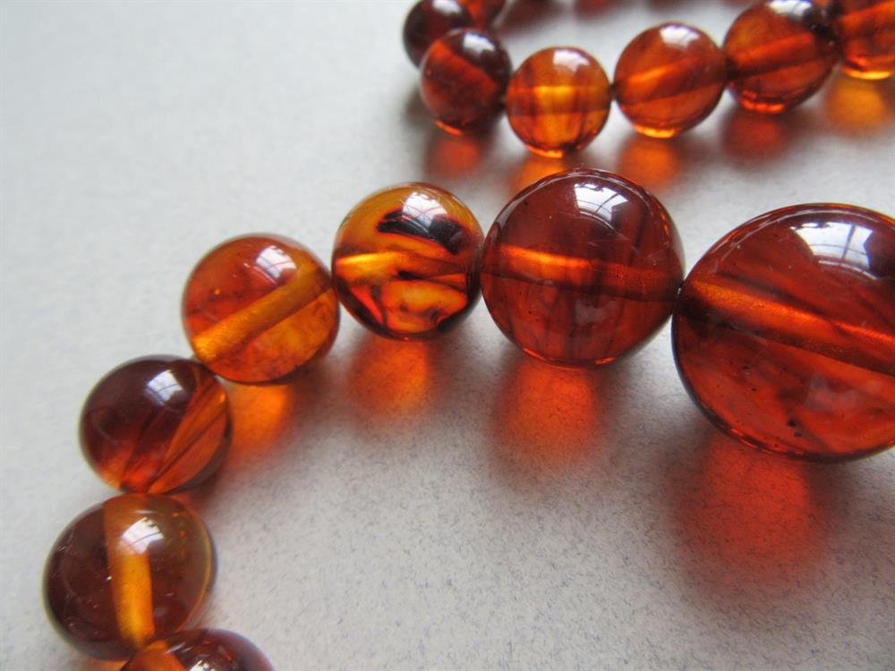 Restrung bakelite, catalin or French bakelite graduated necklace. We tested this necklace with Simi chrome and it tested positive. However it flunked the rub and hot water test. So this may be catalin, French baklelite or possibly lucite.