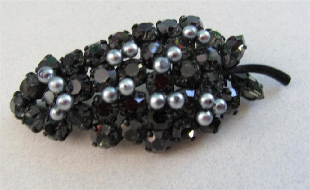 Very pretty black japanned rhinestone pin accented with small gray faux pearls. Some of the pearls have some scuffs. Does not take away from this piece. It measures just under 3" long. Signed Made In Austria. Sold as is.
