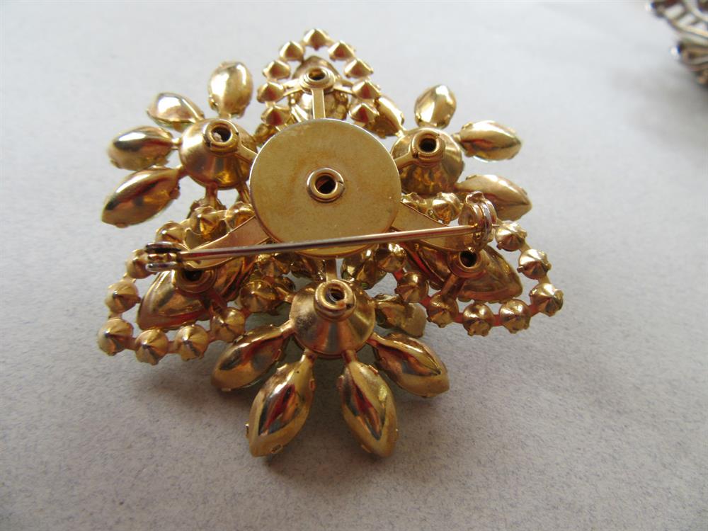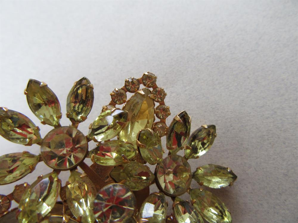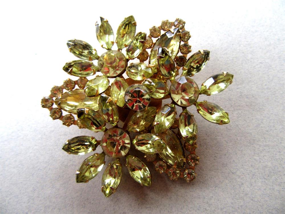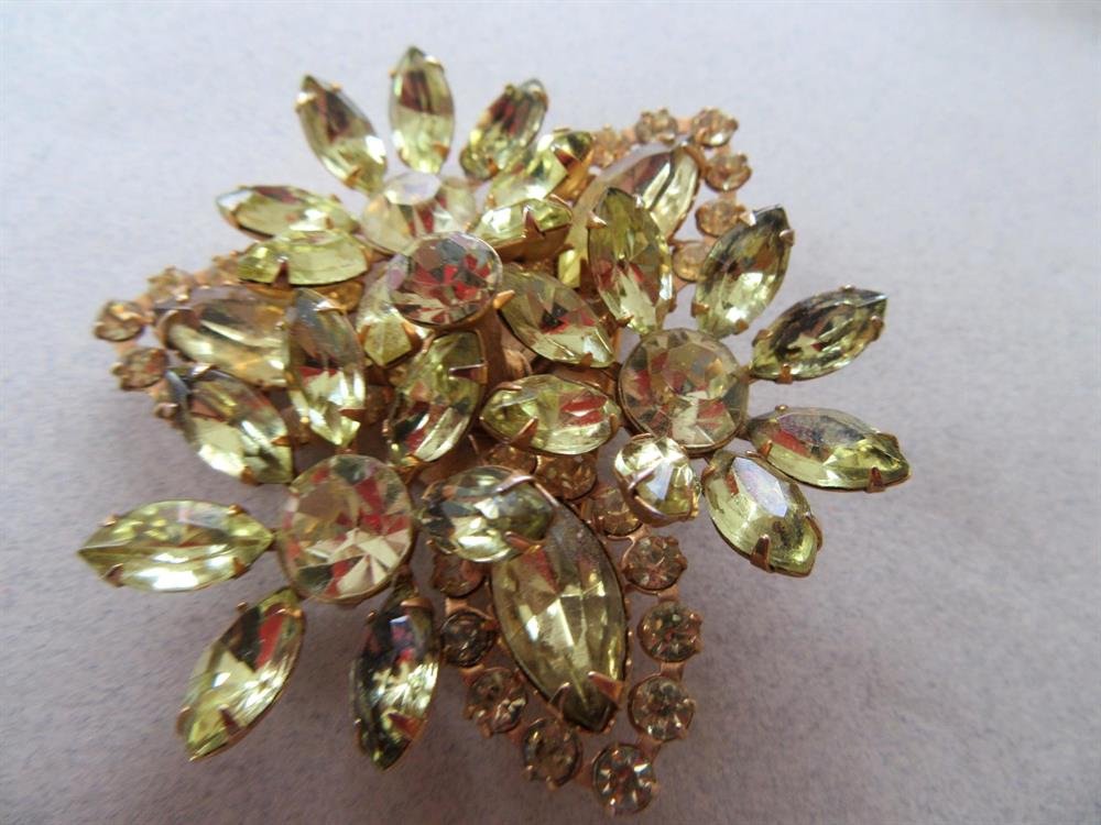 Vintage citrine color rhinestone pin. It measures 2" across. It ha some darker areas in some of the stones. Still wears sparkly! Sold as is.