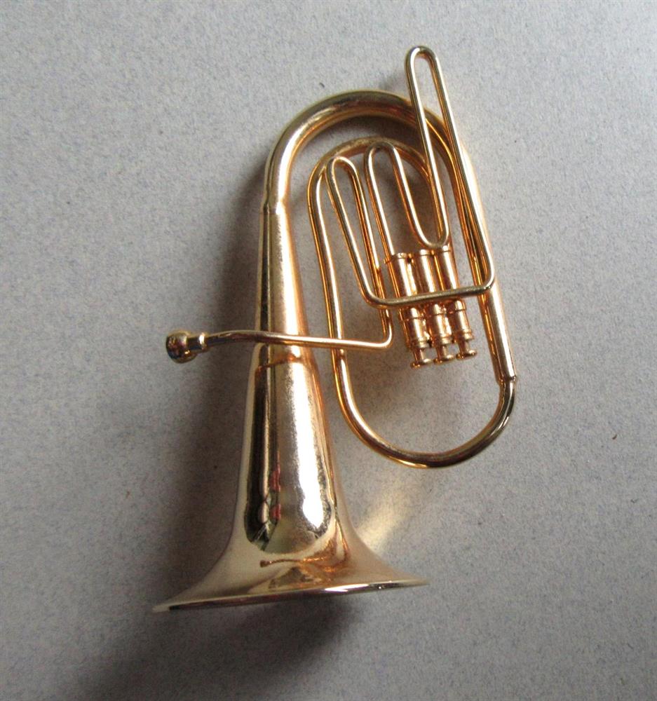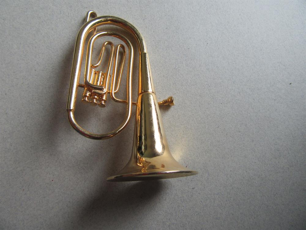 Very detailed and well made miniature metal tuba. Please excuse any color reflections you may see in the back of the bell. Appears to be quality made. Measures about 3" long and it is in really nice shape.