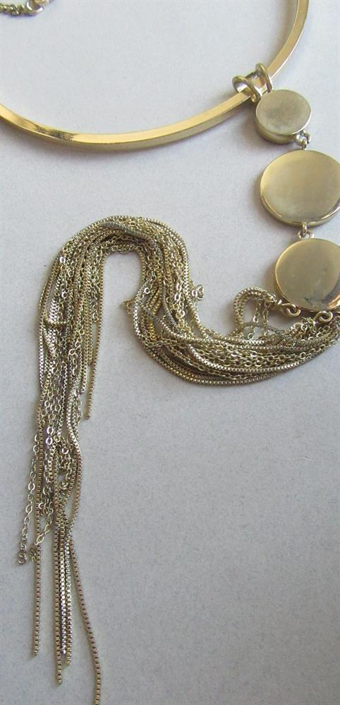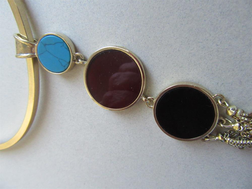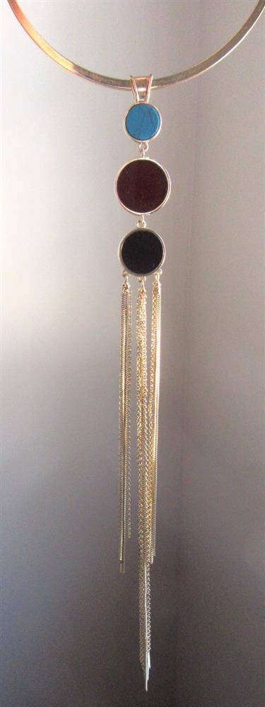 Express Egyptian style faux stone hoop necklace with 13" long pendant with chain tassel. The color of the cabochons are turquoise, black and cranberry.