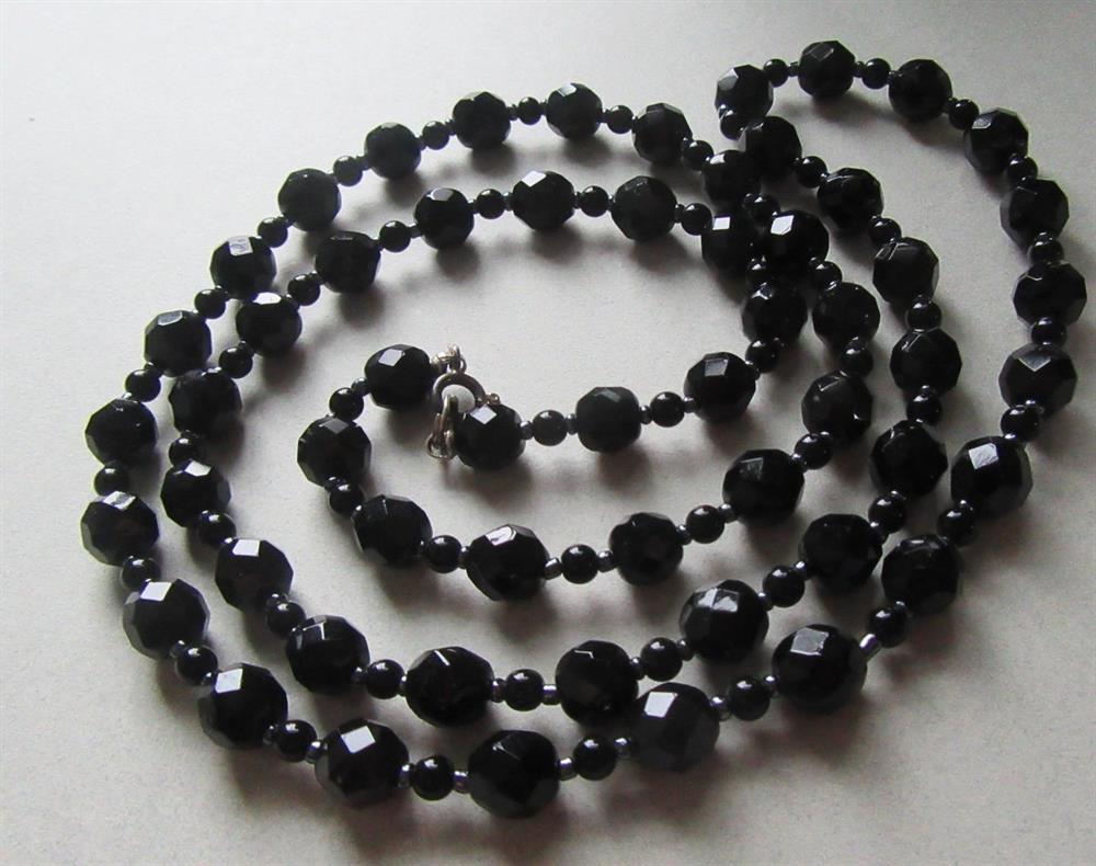 Faceted black glass necklace. It measures 32" long. Biggest beads are approx. 1/4"