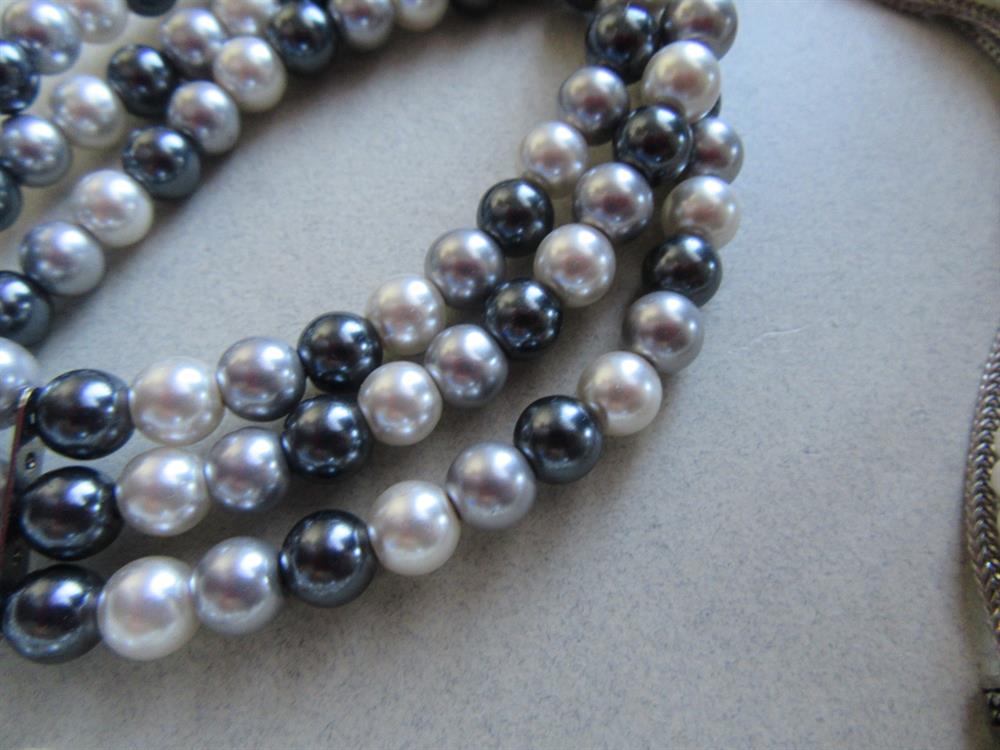 Faux pearl and bracelets lot. The twisted multi strand necklace measures 21" long with a 3 1/2" chain extender. The bracelet in the center is a stretch bracelet. The other silver tone bracelet measures 7 1/2" long. All in excellent shape. Not vintage items, but not brand new either.