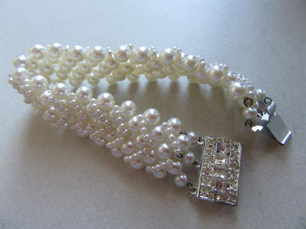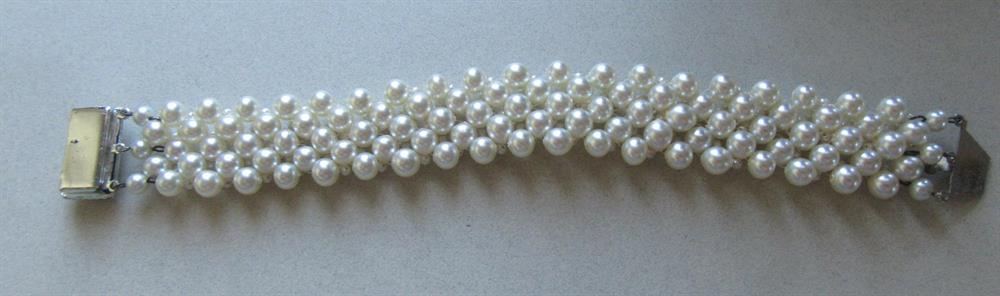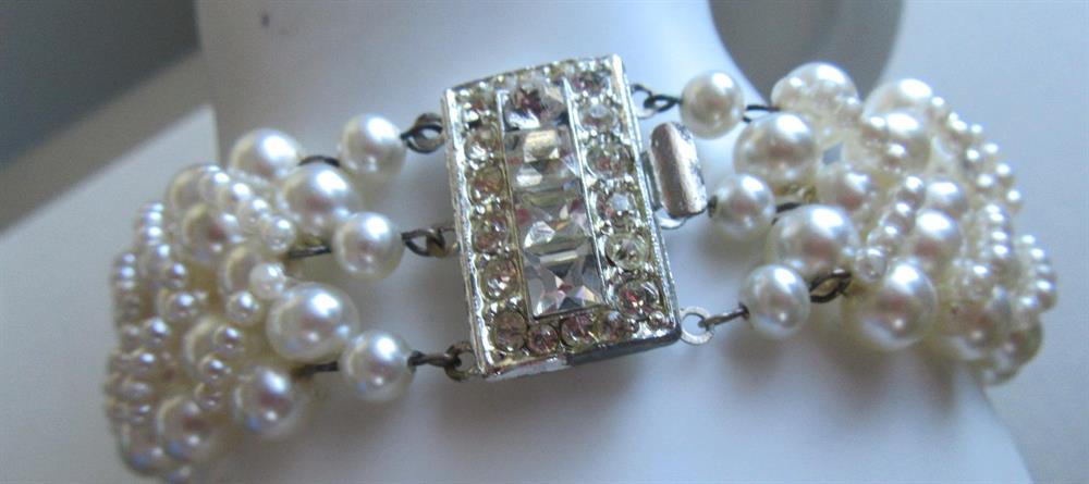 Faux pearl and rhinestone clasp bracelet. It measures 7 1/2" long and 3/4" wide. It has some finish wear on the clasp on the edge of the clasp. Can be touched up with some silver paint.