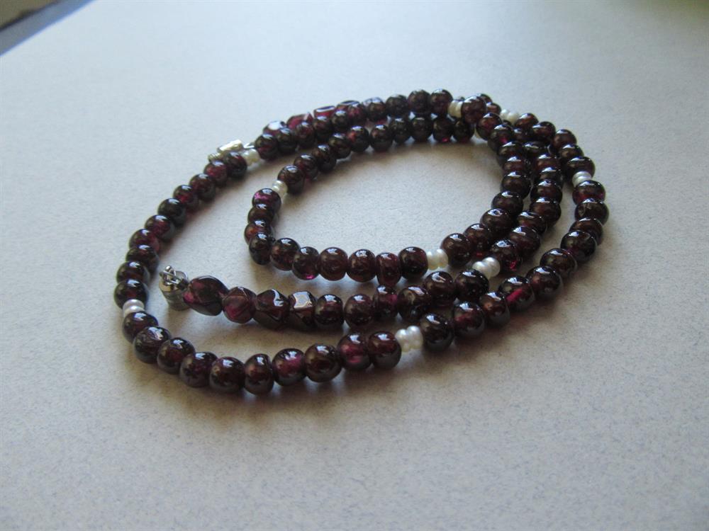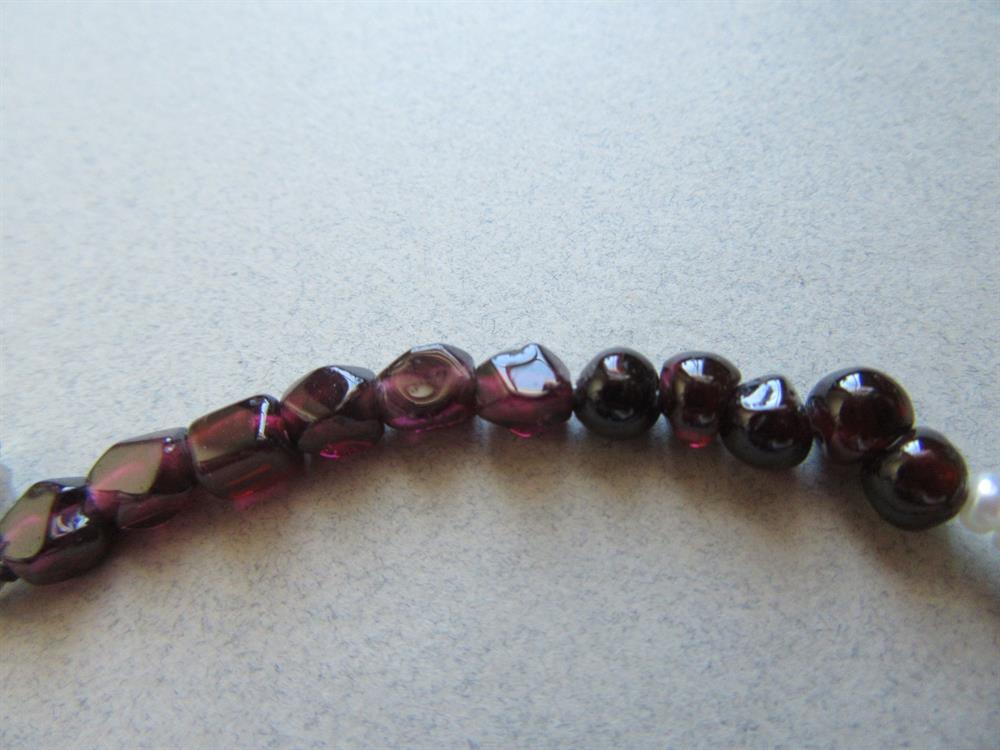 Genuine garnet and genuine pearl seed pearls. It measures 18" long. It hangs sort of rumpled, so this is being sold for the beads for your own creation. Would make some dandy earrings!