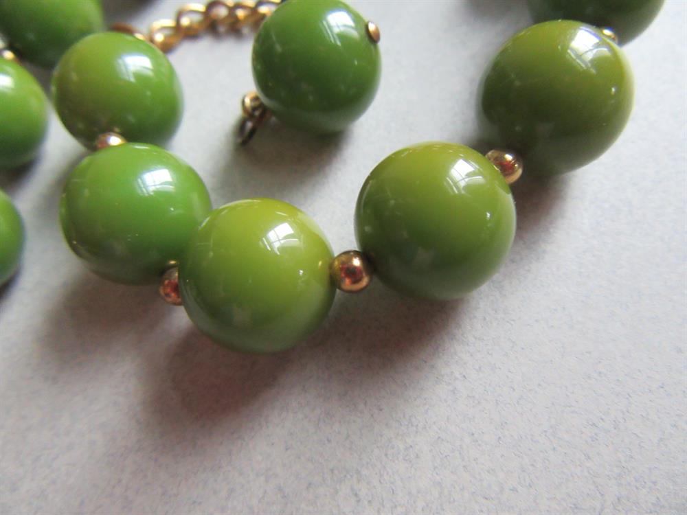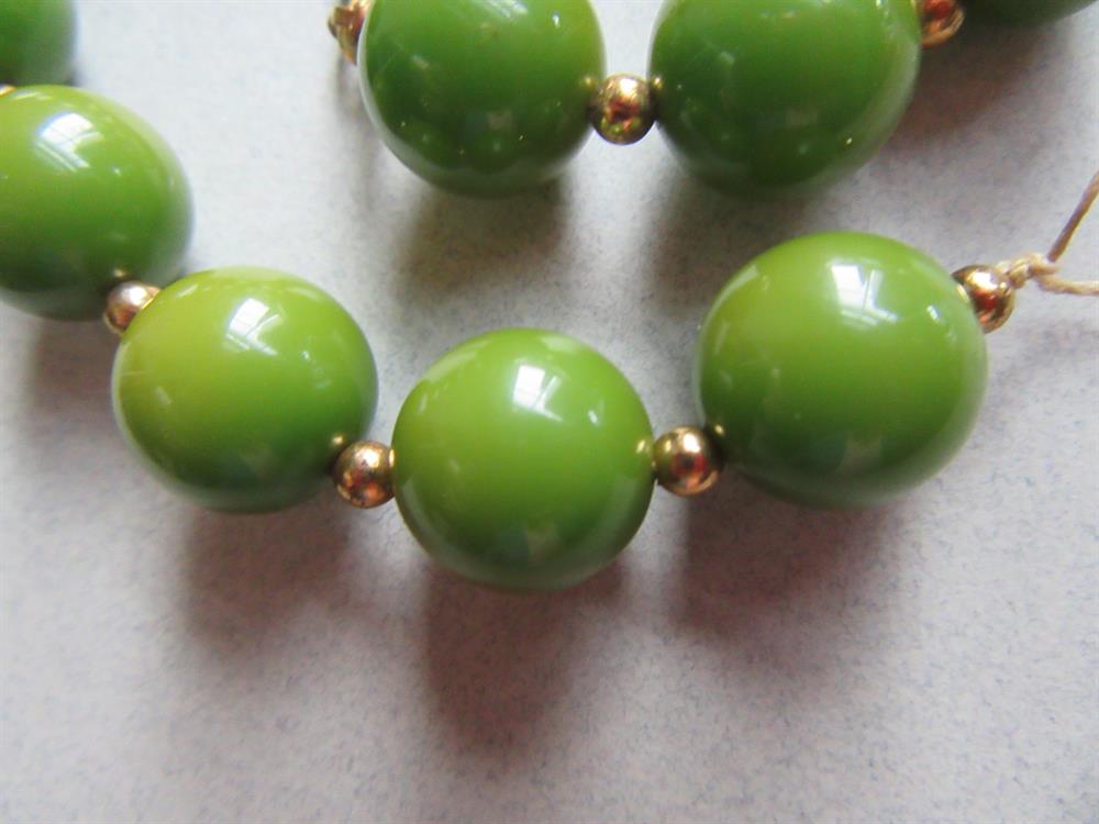 Vintage genuine bakelite green round beads broken necklace. It's hard to tell in the photos, but these have a slight yellow cast to them. Typical of oxidation over the years. There are 20 beads total. In the bag, there are 4 beads and 4 small brass spacer beads. Strictly being sold as a restring project. Sold as is.