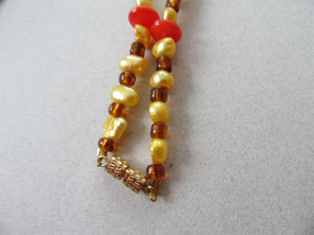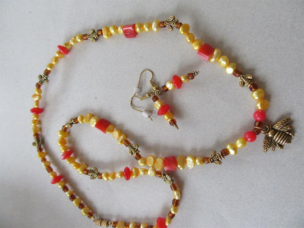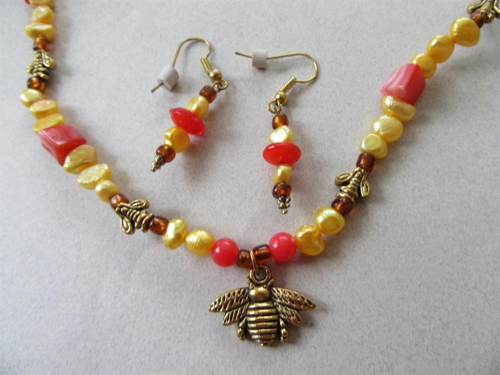 Dyed genuine freshwater pearls and other beads with center bee pendant and spacer beads. Matching pierced earrings. Selling this as a piece to take apart because the necklace hangs kind of rumply. Enough beads and bees to make some dandy earrings.