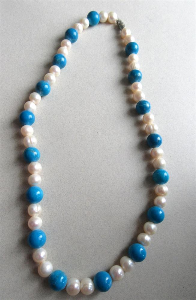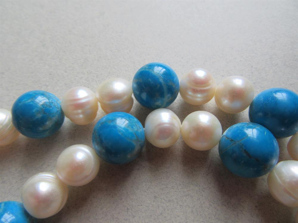 Genuine freshwater pearls and blue stone necklace. Not sure what the blue stone is. Perhaps magnesite? It measures 18" olng. Has a screw barrel clasp.