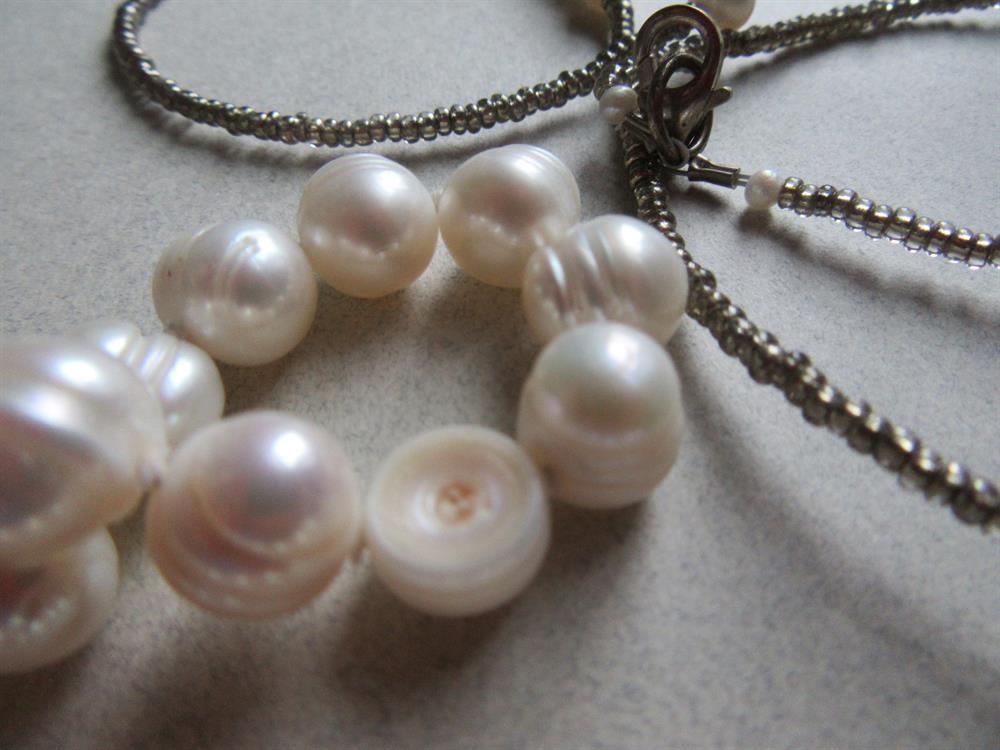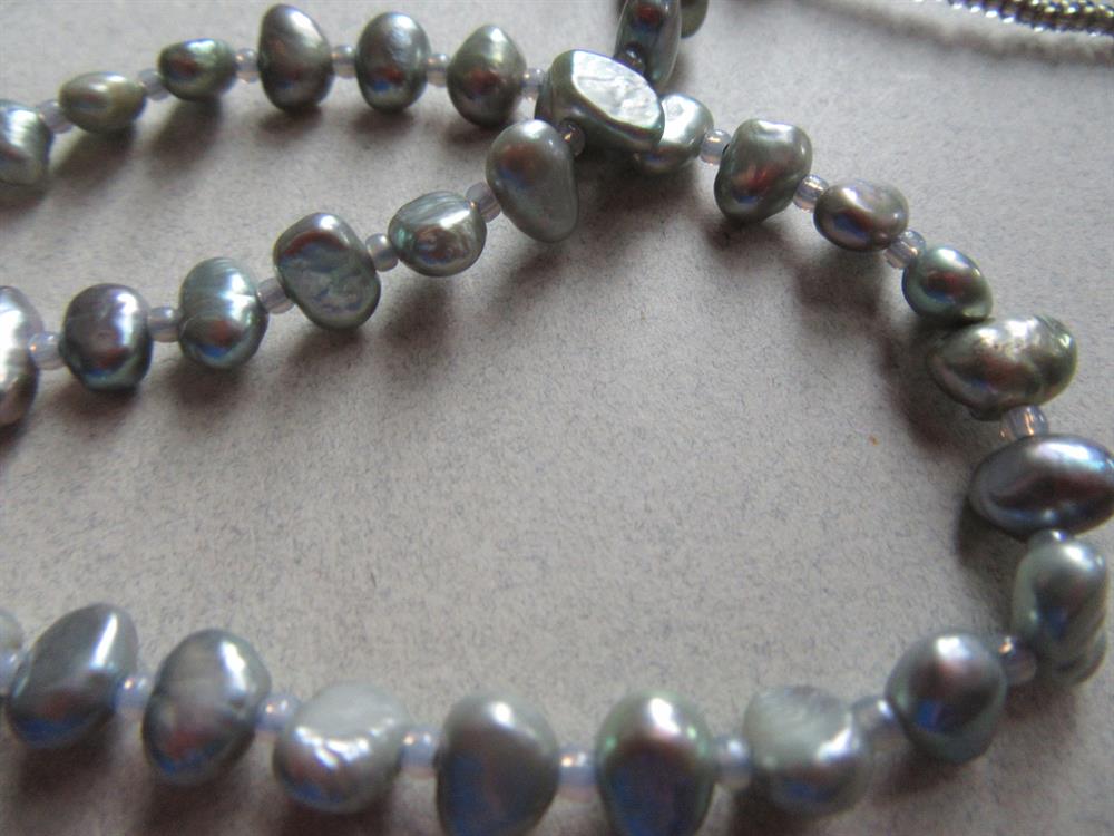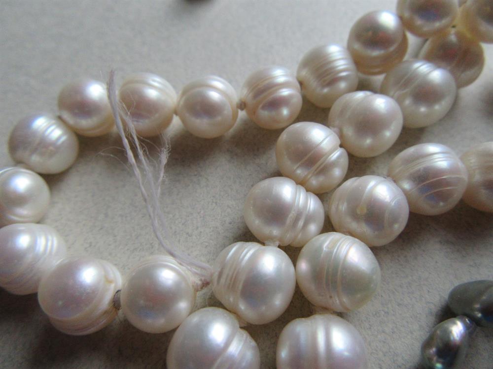 Genuine pearls lot. Two necklaces that do not hang correctly and a broken strand with one pearl that is damaged. One necklace has 12 round pearls with gray glass seed beads and the other has gray dyed freshwater pearls. Each of the two necklaces have sterling silver lobster claw clasps. They are both marked 925.