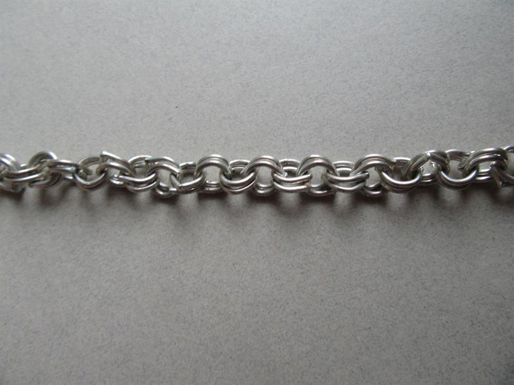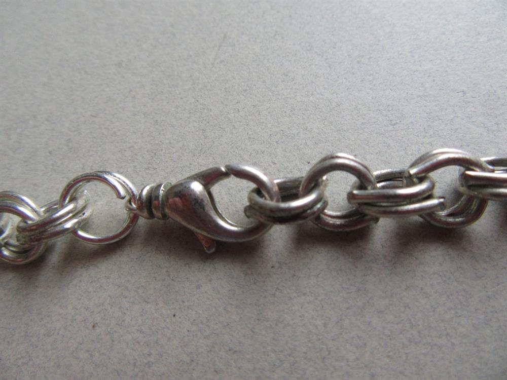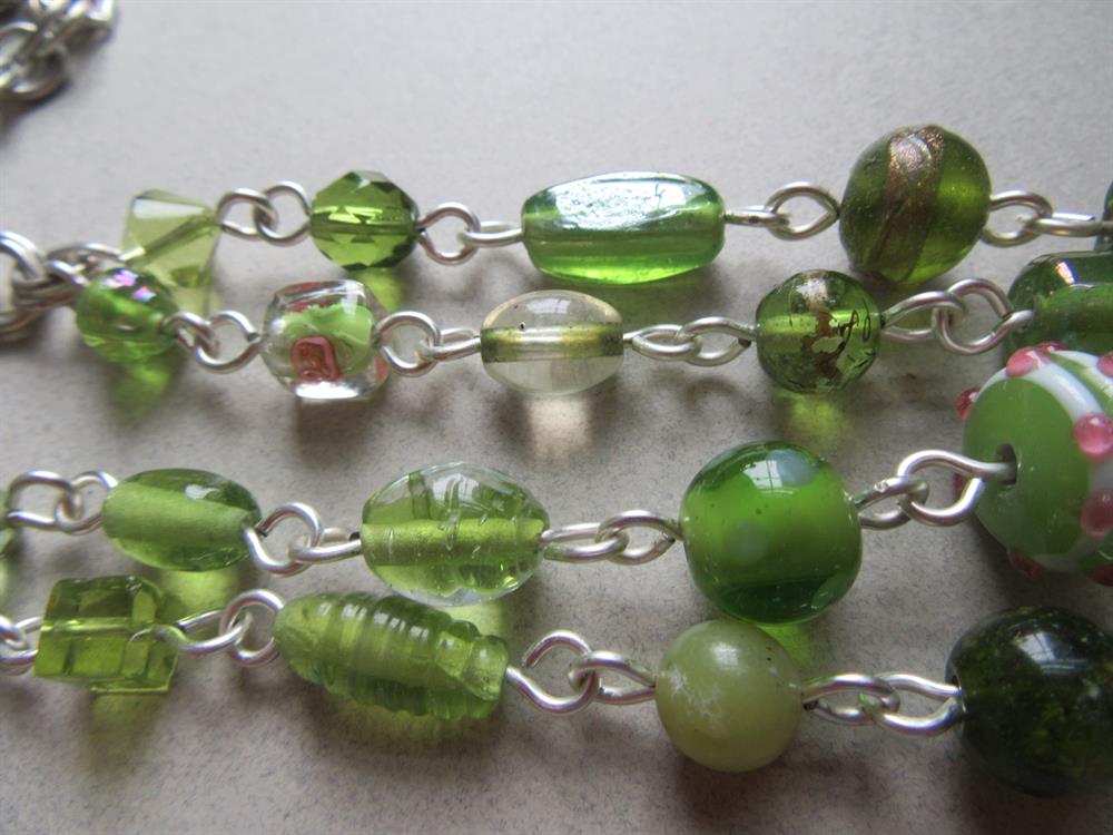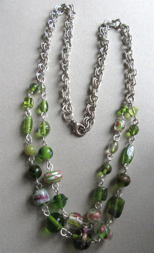 Wedding cake Venetian glass green, pink and white beads with silver tone double chain necklace. It measures 26" long. Very pretty. Excellent shape. Not vintage.