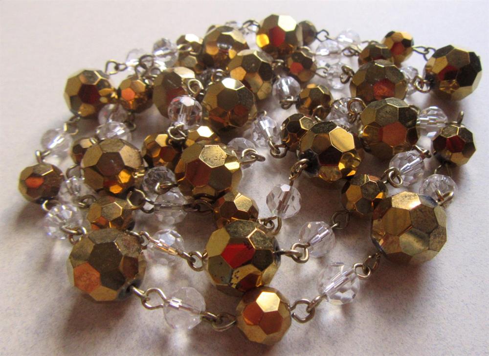 Measures 36" long.The largest beads are about 1/2". Some slight wear, but it is SO sparkly it is hard to notice when worn. Lobster Claw clasp.