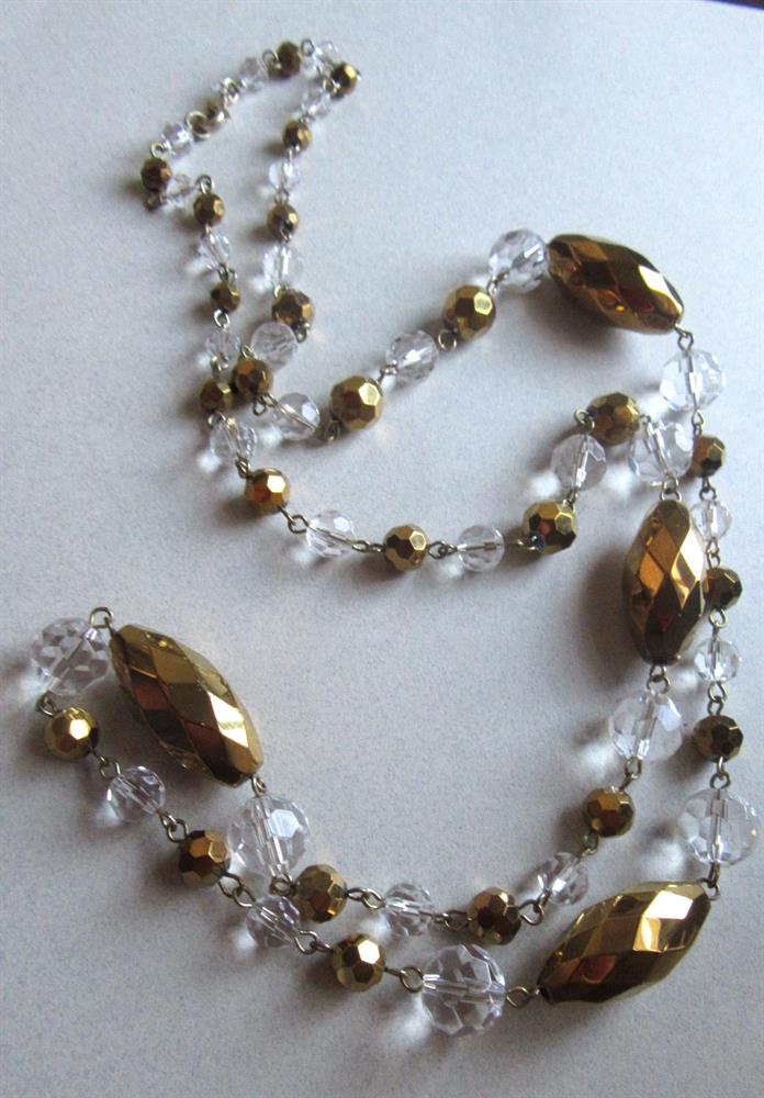Measures 36" long. The largest beads are 1 1/2" long. Some slight wear, but it is SO sparkly it is hard to notice when worn. Lobster Claw clasp.