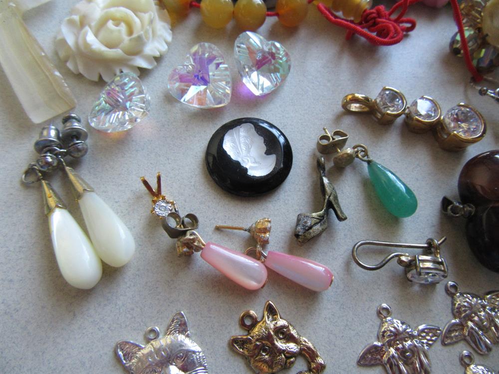 Vintage and up jewelry parts pendants, MOP earrings, charms and more lot. Odds and ends.