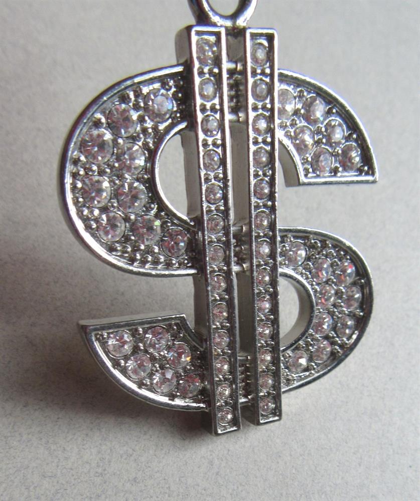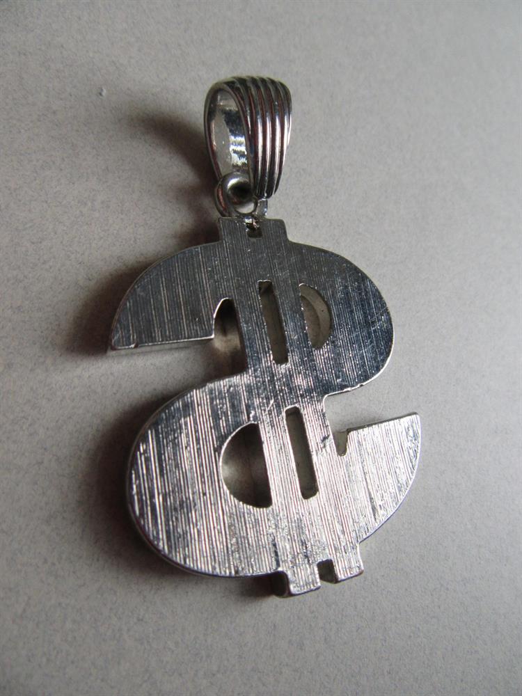 Large rhinestone dollar sign pendant. It measures 2 1/2" long and 1 1/2" wide.
