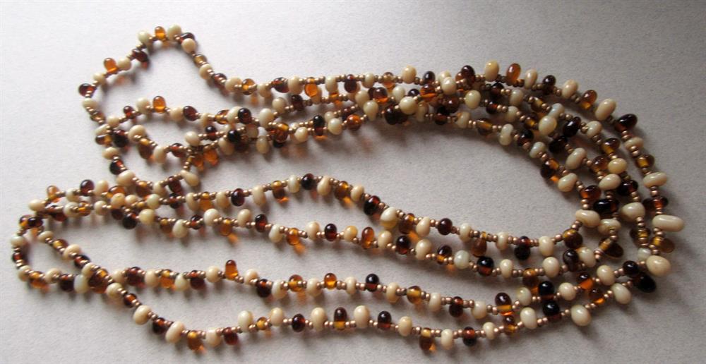 Very long all glass earth tones necklace. Measures 62" long and in excellent shape. Great to double up.