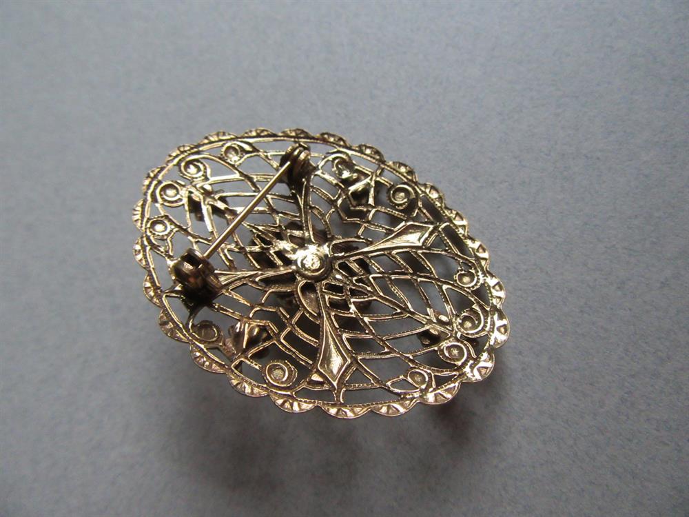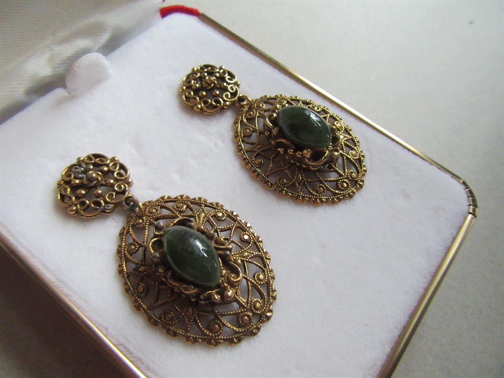 Lord and Taylor pin and pierced earrings set in the original box. Green glass centers. Tiny faux seed pearls on the pin. Never worn. Excellent shape. The pin measures 1 3/4 " long.