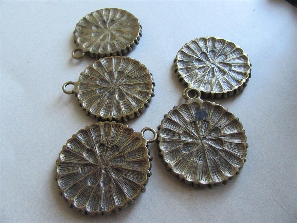 Five lucite stone medallions or pendants. Never used. They measure 1 1/2" across. These are really nice. they have a boho look to them. Excellent shape.