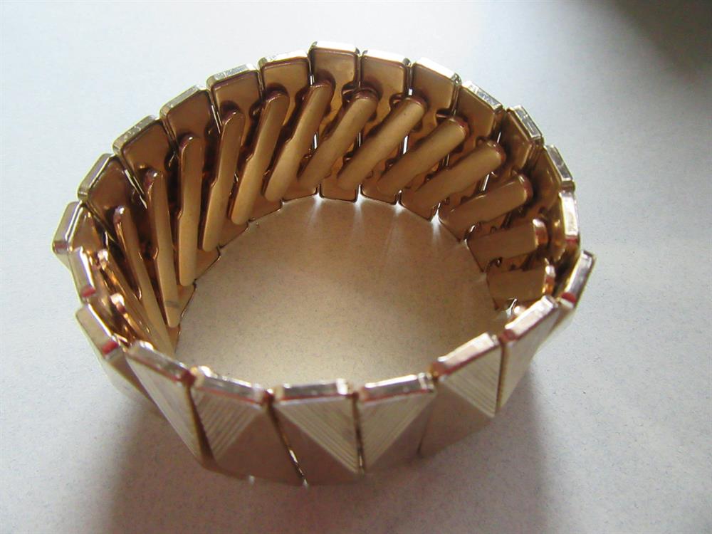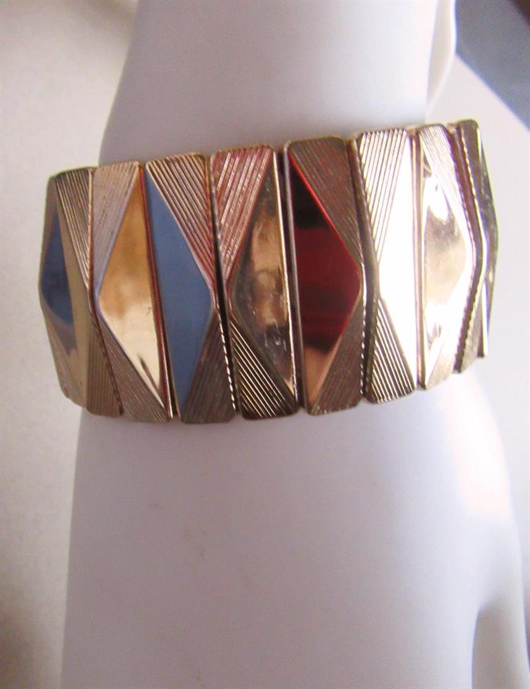 Vintage mid century Bergere signed gold tone expansion bracelet. Please excuse the red-ish reflection from my camera. Signed Bergere and Japan on the interior. This bracelet is 1 1/4" wide and is in great shape!