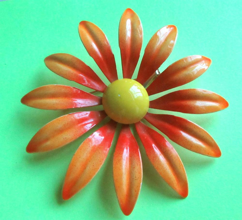 Large mod vintage 1960's metal orange daisy pin. It measures 3 1/8" across. It has one small area in the back that has a little wear. No big deal! And one tiny speck on the front center. But as you can see, it doesn't matter for this fun and sunny pin.