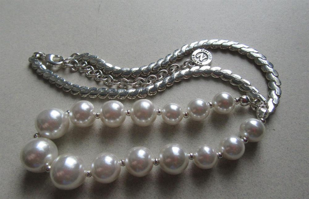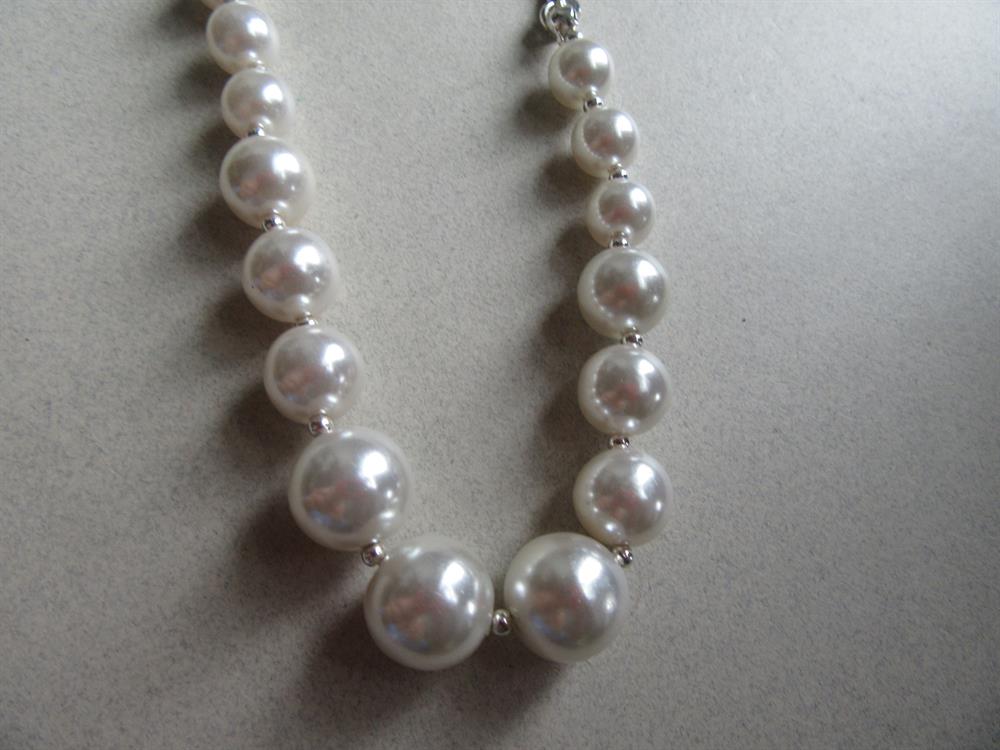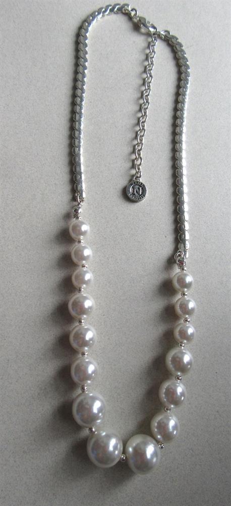 Napier signed faux pearl chain necklace. It measures 20" long from tip to tip and the largest center bead is 1/2" across. Excellent shape. Not too vintage, but not new either.