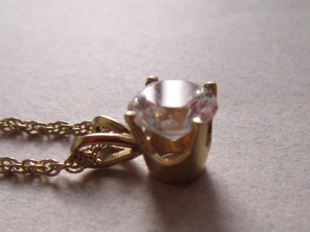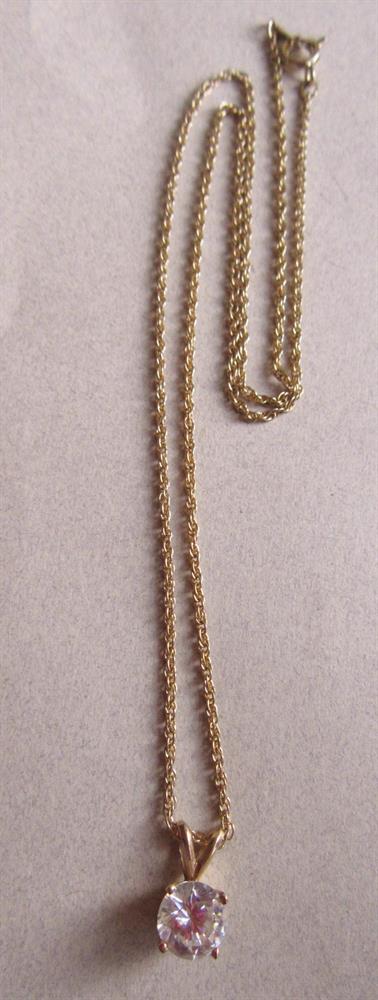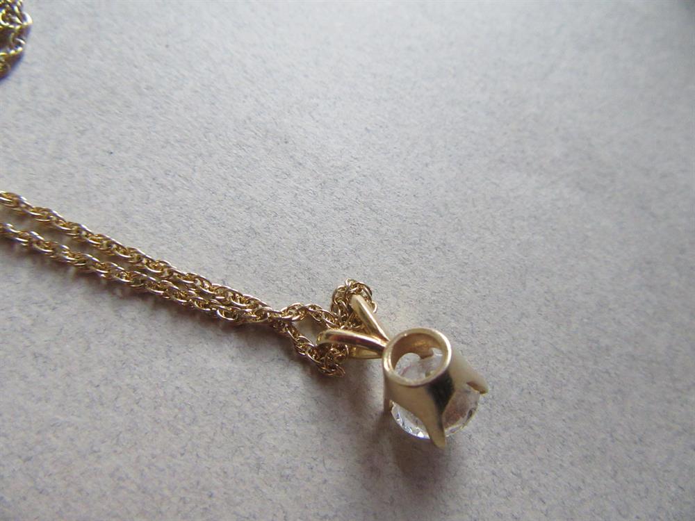 One carat faux diamond pendant on 18" gold tone chain Perfect jewelry to travel safely with. Leave the good stuff home! Excellent shape.