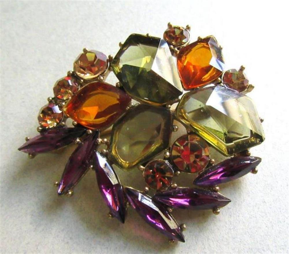 Vintage 1950's multi colored open back glass rhinestone pin.