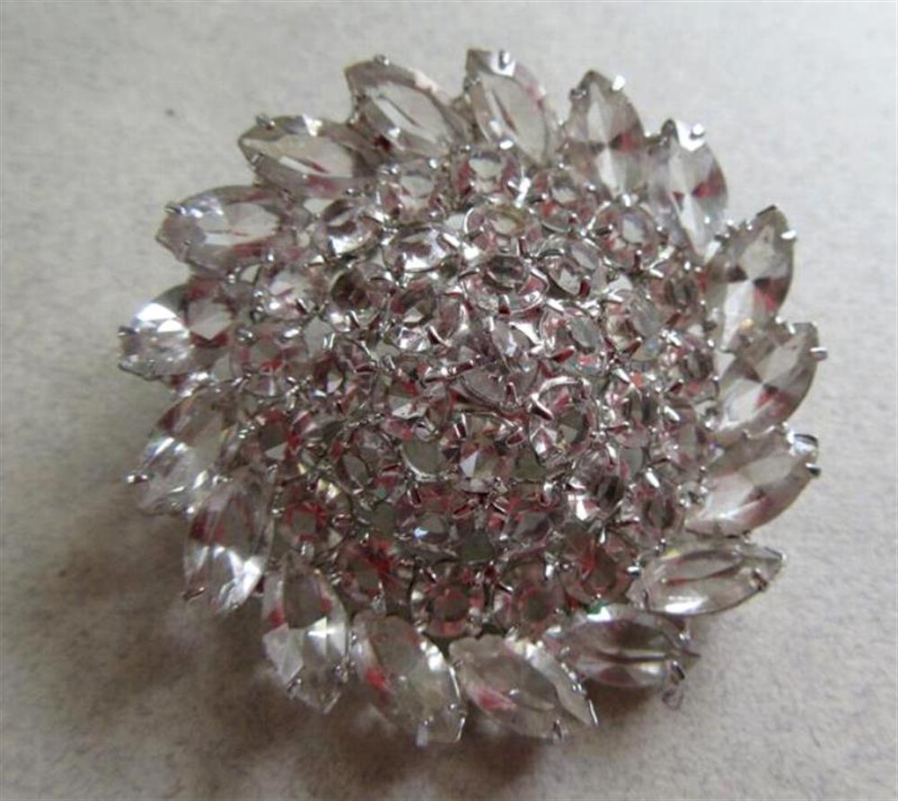 Vintage mid century open backed rhinestone pin with clear stones. Measures 1 1/4" across. Photos are enlarged to show detail. Excellent shape.
