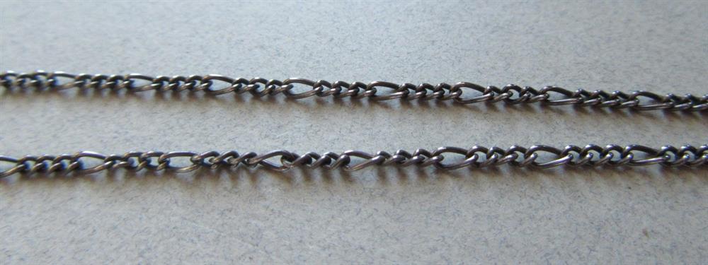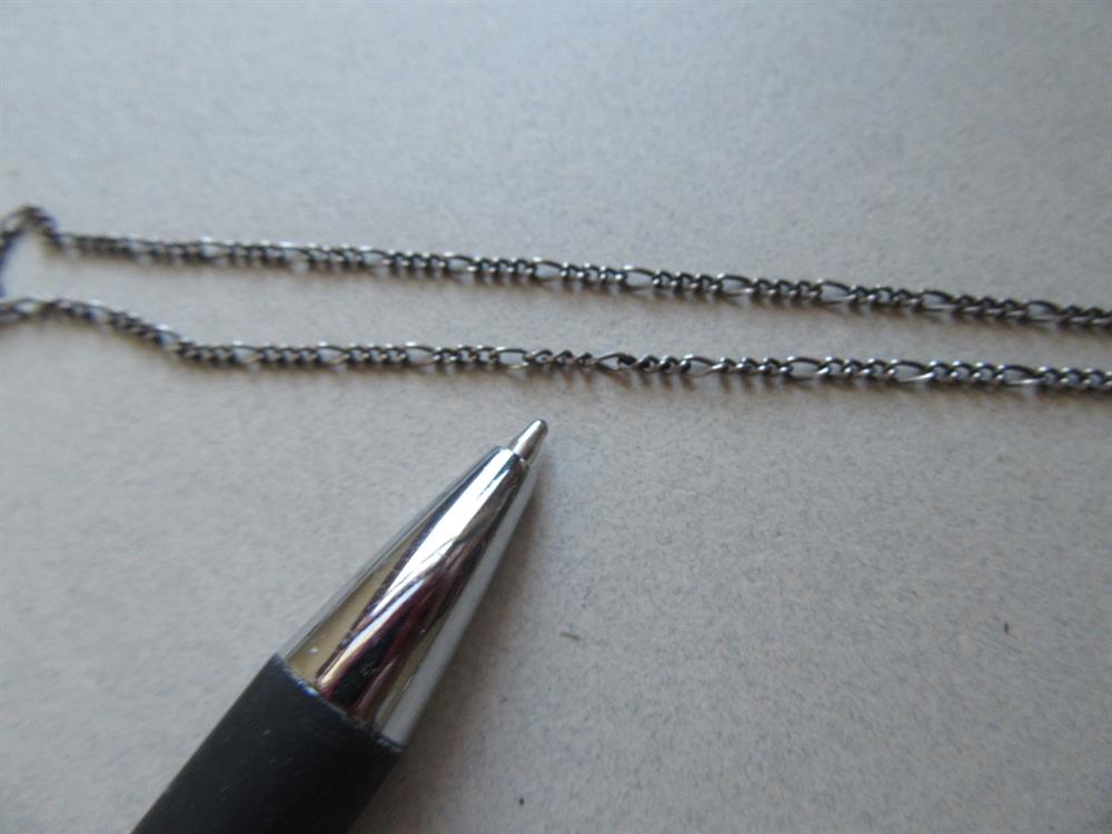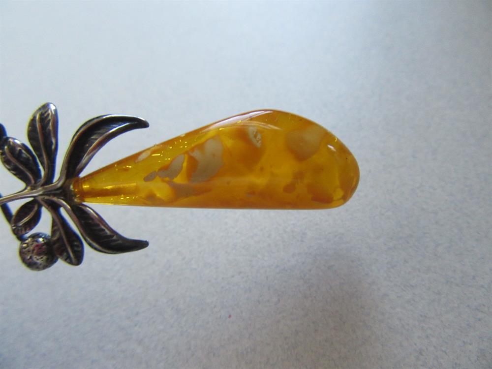 Sterling silver pendant with tear drop shaped amber? pendant. Not sure if this is genuine amber or not? The pendant measures 2 1/2" long. The chain measures 24" long. Both pieces are marked although not very legible. The chain needs to be polished. Fabulous shape.
