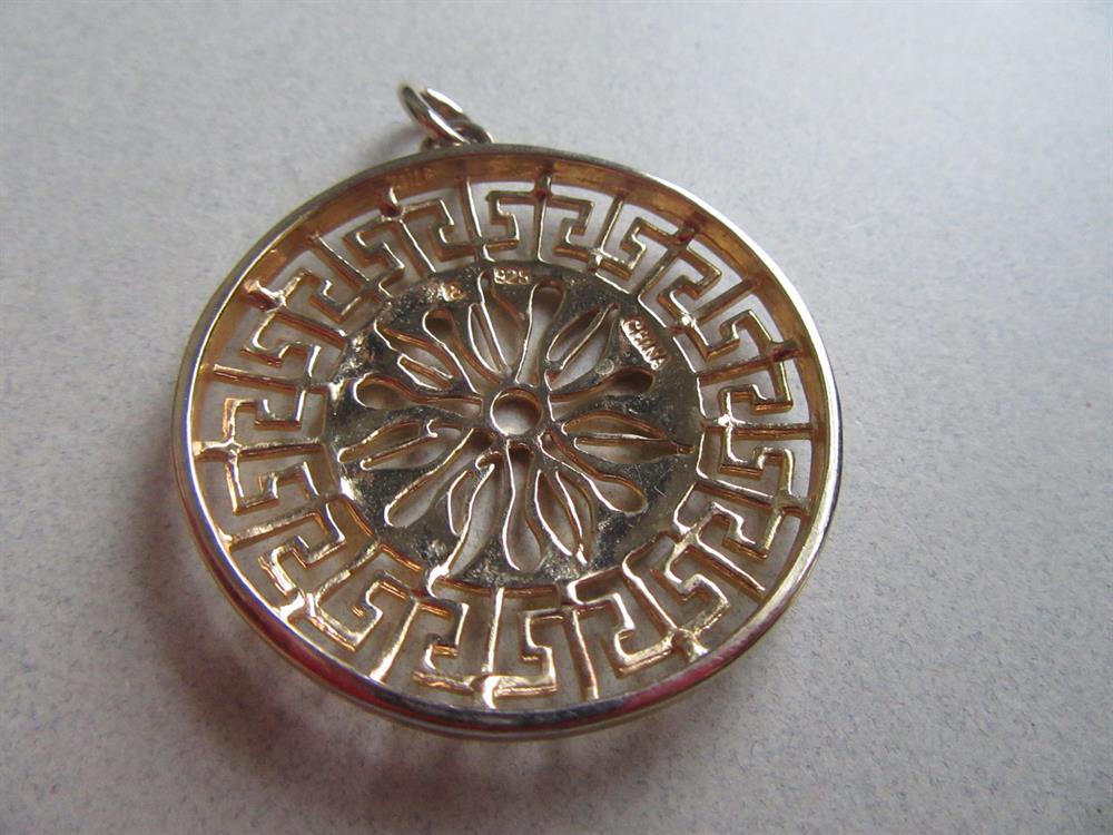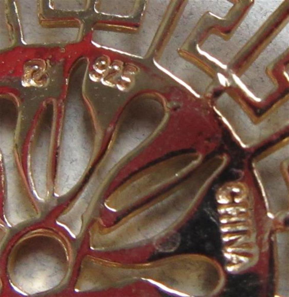 Gold tone sterling silver filigree pendant marked 925 (sterling) and China on the back. Please excuse any red-ish reflections from my camera.