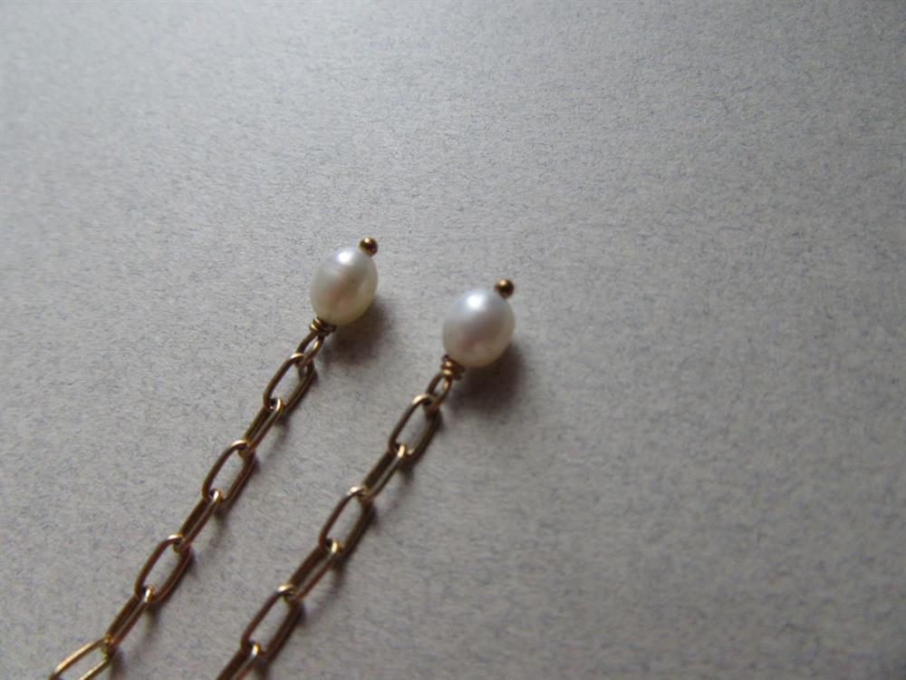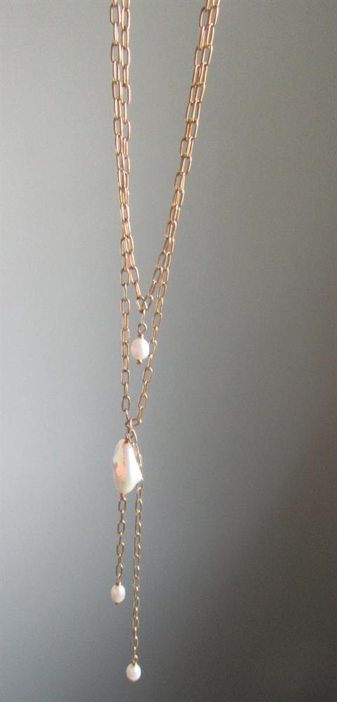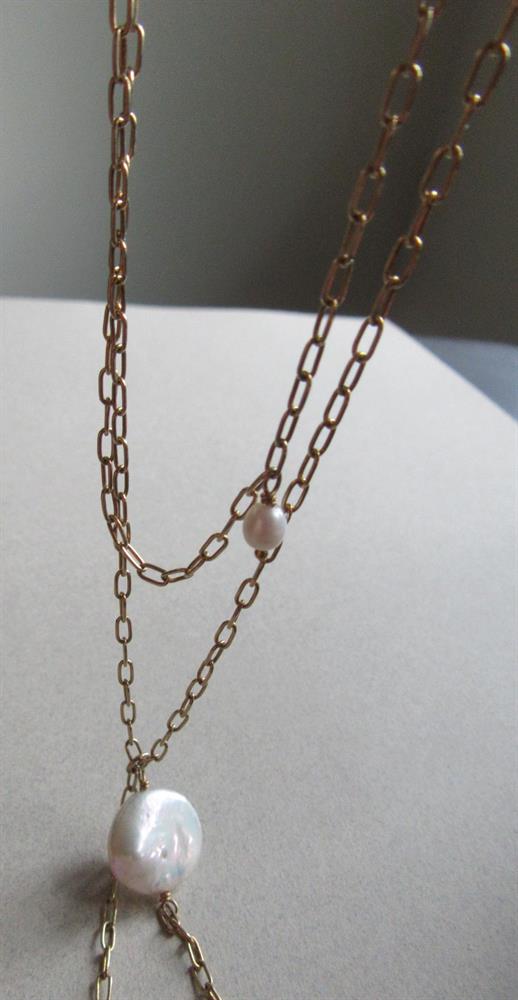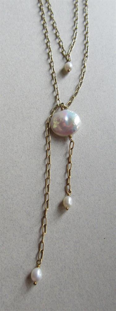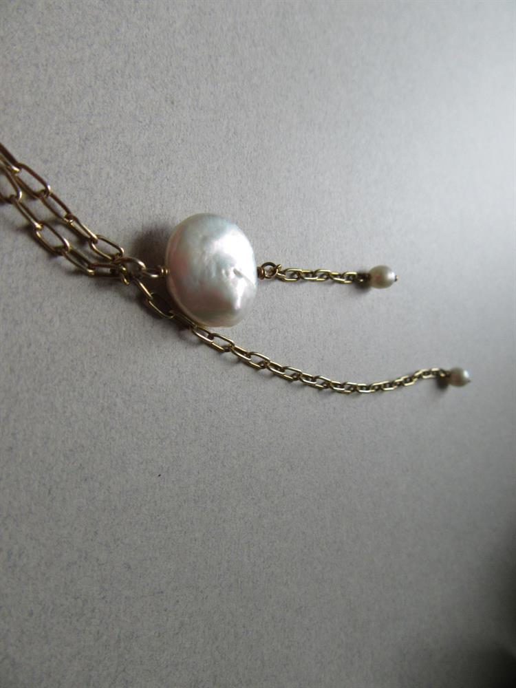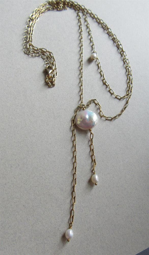 Very pretty sterling silver necklace with a gold wash and coin pearl pendant with three smaller genuine pearls. The smaller chain measures approx. 18" long and the longer one is approx. 20" long and the drop is another 3" long. The coin pearl measures 1/2" across. The clasp is marked 925 (sterling) and it has a gold wash.