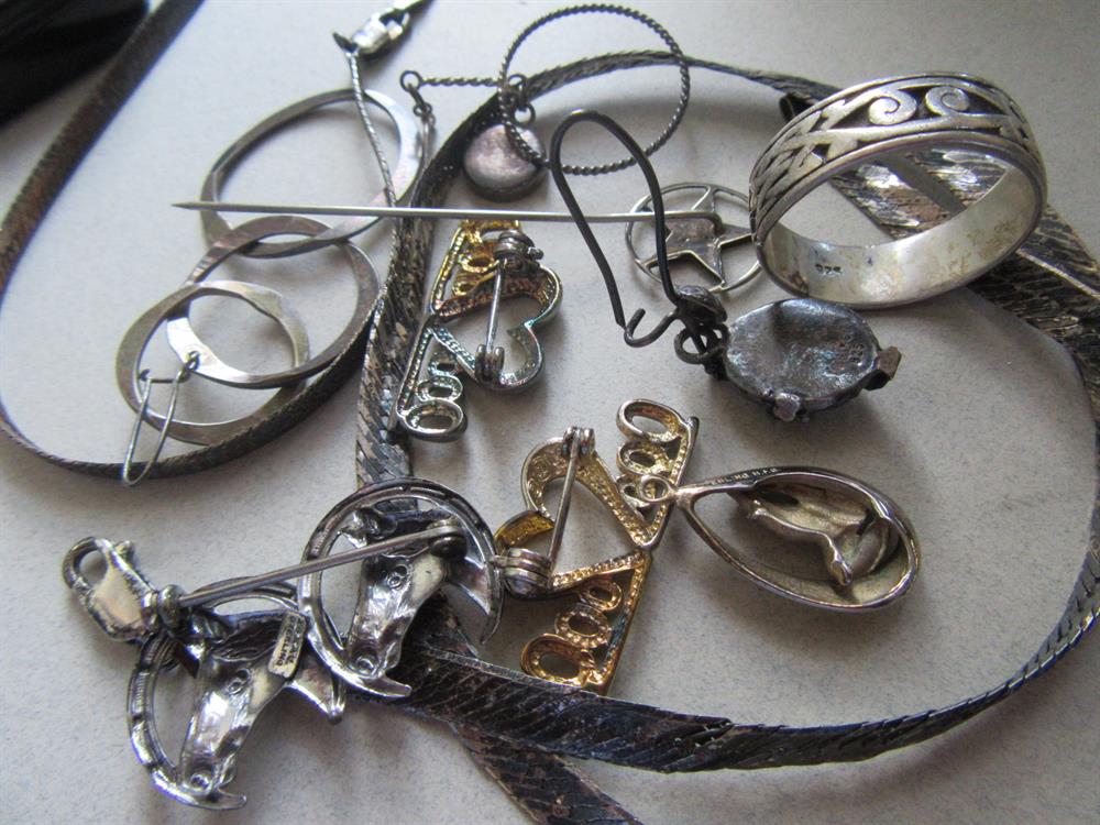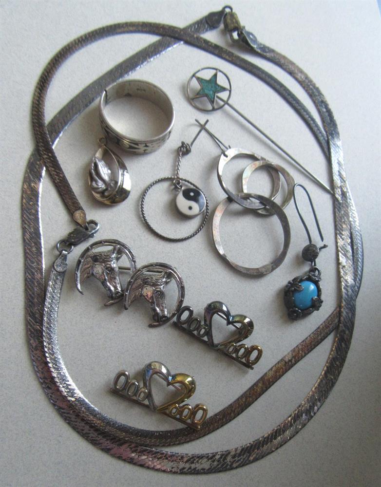 Tarnished sterling silver scrap lot. It weighs 46 grams. The chains can be cleaned and the single earrings and pins are also wearable. The two heart pins have a gilt finish and are signed 925 under the curve on the backs. Very hard to find without a jewelry loupe. The chains (17 1/2" and 16 1/4") are signed Italy and 925. The praying hands pendant is marked 925. The horse pin is marked Beau Sterling.