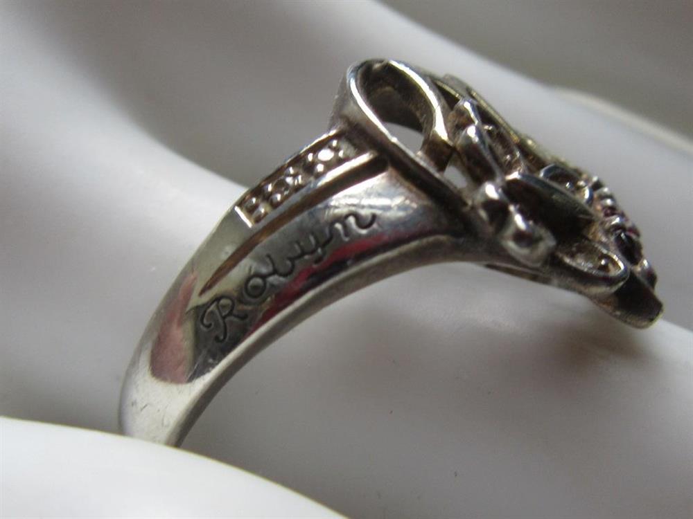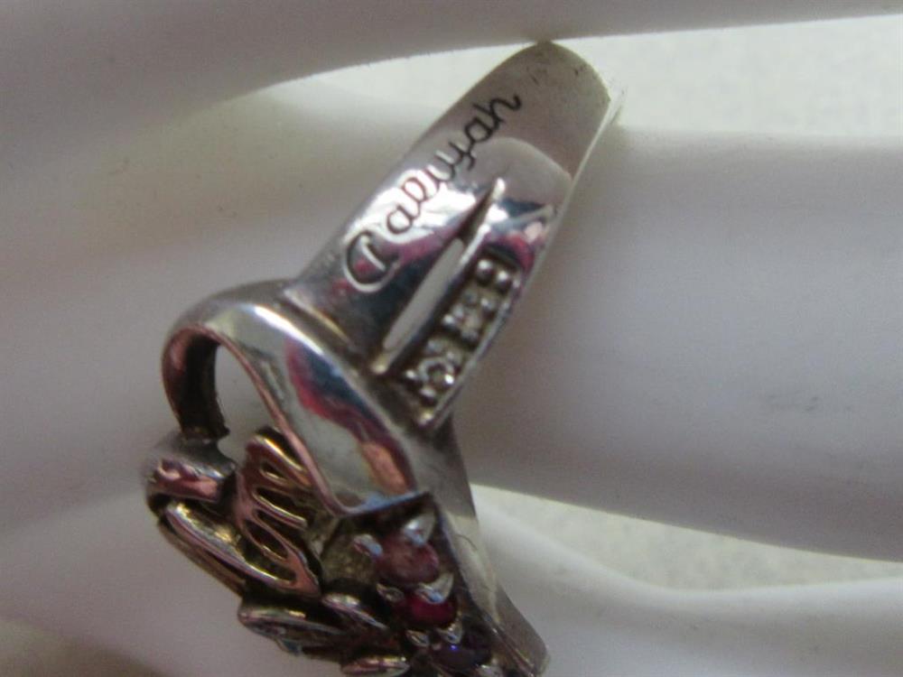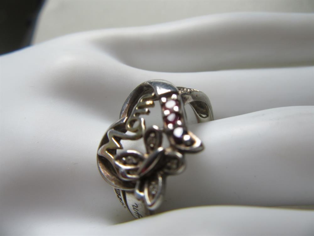 Sterling silver and gemstones heart and butterfly Mom ring. It does have two names engraved on either side off the heart which is Robyn and Aaliyah.